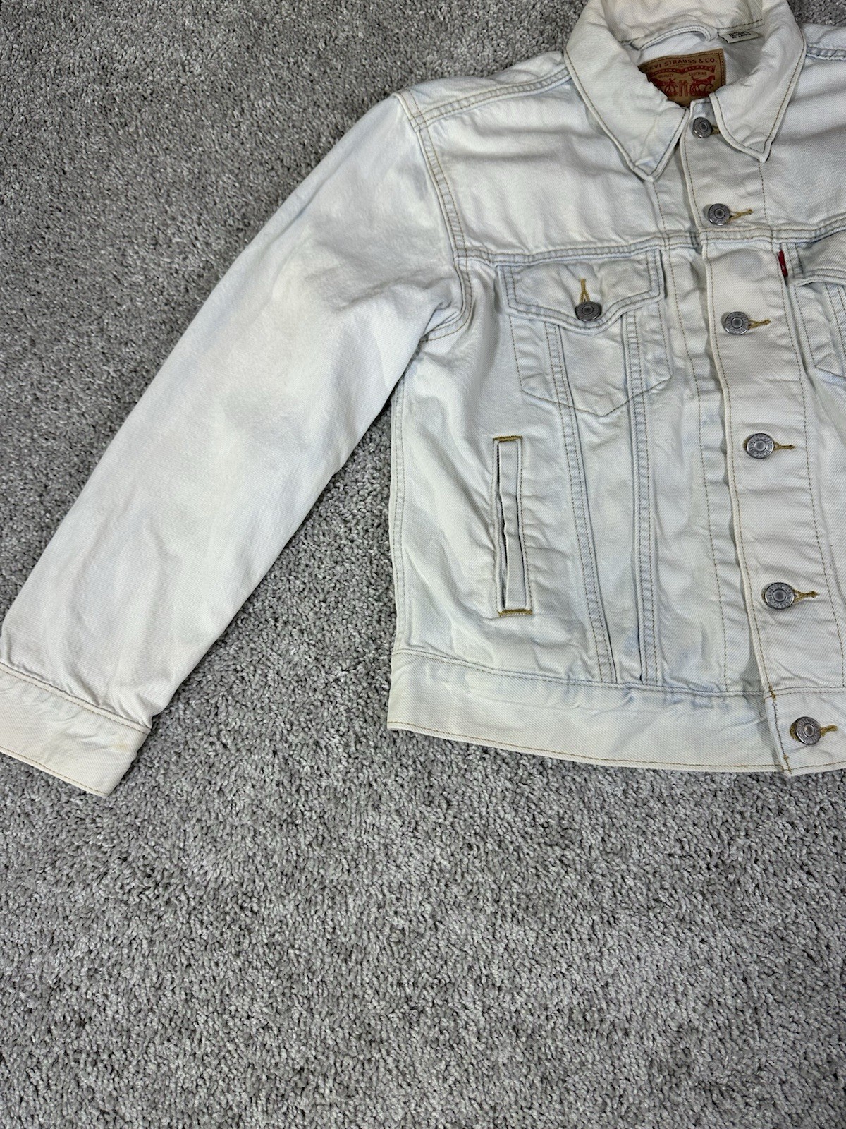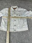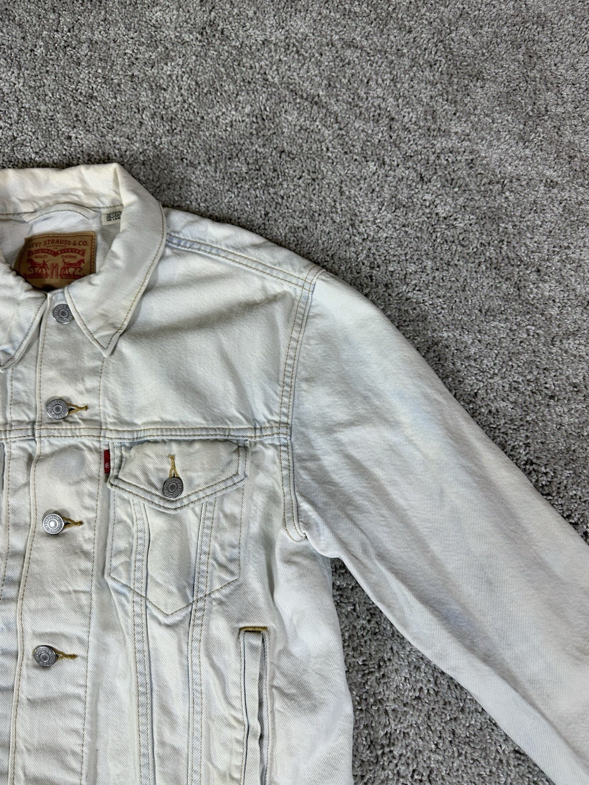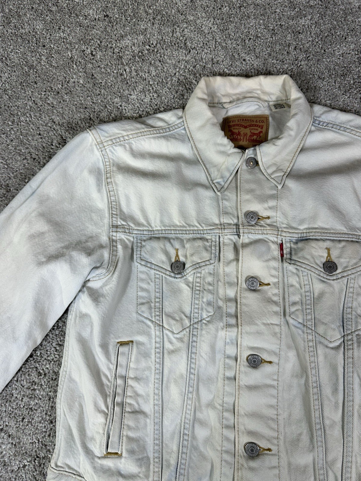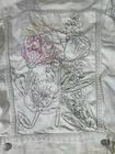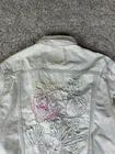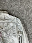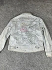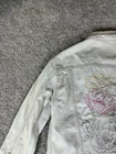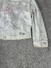 The Levi's Embroidered Floral Denim Trucker Jacket in women's size medium features a light wash with a cotton outer shell and lining material. The jacket has a button closure, long sleeves, and a short length, making it suitable for casual occasions and travel. The embroidered floral pattern adds an Americana and coastal cowgirl theme to the basic jacket style. Machine washable for easy care, this Levi's Trucker Jacket is a versatile addition to any woman's wardrobe. 3020
