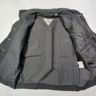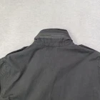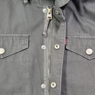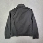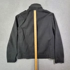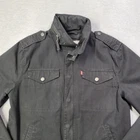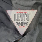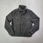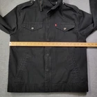 This is a Levi's black jacket for men in size M, featuring a full zip closure, high neck with button-up flap, stand-up collar, and biker style. It is made of cotton canvas with a polyester lining and has pockets.
