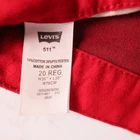 Country/Region of Manufacture: China Brand: Levi's Model: Levi's 511 Closure: Button, Zip Department: Boys Pattern: Solid Color: Red Features: Stretch Character: Boy Size: 20 Size Type: Regular Type: Jeans Occasion: Casual, Party, Travel Inseam: 29 in Garment Care: Machine Washable Performance/Activity: Dance, School, Walking Waist Size: 30 in Style: Straight Fabric Wash: Dark Fabric Type: Denim Vintage: No Fit: Slim Seller Notes: “Good - see photos for dimensions & details.” Handmade: No Material: Cotton Blend