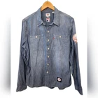 New York Yankees Patch Limited Edition MLB Levi's Chambray Shirt Size Medium excellent condition. no stains, pilling or holes. laying flat measurements in inches pit to pit 21 shoulder to hem 27 About this Style Limited-edition gear -- For true fans of the game. Our officially licensed Levi's® Major League Baseball Collection celebrates your team spirit with our iconic styles. This workwear-style shirt has timeless utilitarian style, and is proudly embellished with team details for this season and beyond.