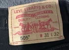 Elevate your wardrobe with these classic Levi's 505 regular fit straight pants in black, size 31x32. Made from high-quality cotton material, these pants are designed to provide maximum comfort and durability. The flat front and button closure add to the overall style and make them perfect for any occasion, whether it's for travel, party/cocktail, casual or business. The 5-pocket design and Levi's logo accents make them versatile and stylish. These pants are machine washable and easy to care for. The vintage look and solid pattern add to their overall appeal. Perfect for any season, these pants are a must-have for any fashion-forward individual.