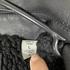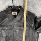 Levis Faux Leather Shirt Jacket Mens Large Black Sherpa Lined Trucker Coat Condition: Gently worn, no visible flaws or damage. All buttons and snaps intact. Shell face: 100% polyurethane faux leather Back and body lining: 86% polyester, 10% rayon, 4% other fibers Sleeve lining and filler: 100% polyester Classic shirt jacket with metal snap button front closure for easy wearing Two front snap-flap chest pockets and two side hand pockets for utility Fully sherpa fleece lined interior for warmth and comfort Levi's red tab branding on chest pocket, signature interior Levi's label Tag size: Large (Mens) Made in China Timeless black color, versatile style great for casual, streetwear, or outerwear layering