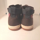 Elevate your shoe game with these stylish Levi's ankle boots. The brown leather upper and round toe shape give these shoes a classic look, while the lace-up closure ensures a secure and comfortable fit. The rubber outsole provides durability and traction, making these boots suitable for any casual occasion during the summer, fall, or spring seasons. Featuring the Levi's logo accents and cushioned insole, these boots offer both style and comfort. With a regular calf width and ankle shaft style, these boots are perfect for men who love the chukka style. Available in size US 9, these pre-owned boots are a great addition to any shoe collection. Shoes strings are slightly faded.