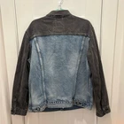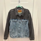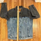 The Levi's Men's Color Block Truckers Jacket in size XL features a stylish light wash denim fabric with a gray blue color block design. This casual jacket has a button-down closure and a button-down collar, showcasing a classic Levi's Trucker style. It includes pockets for added functionality and is suitable for wearing during the summer, fall, and spring seasons. The jacket's design is inspired by hippie, college, 90s, and hip hop themes, making it a versatile and trendy addition to any wardrobe.