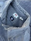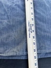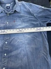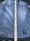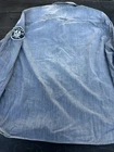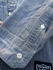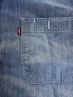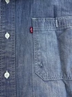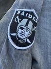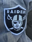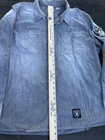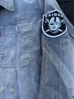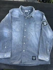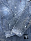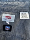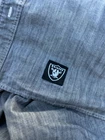 This Levi's NFL Raiders Football Shirt in size 2XL features a collared neckline and long sleeves. Made of chambray fabric, it is gray with a distressed pattern and embroidered NFL patches. The shirt has a button-front style with pockets and a comfortable fit. Perfect for travel, parties, work, or casual wear, it showcases the themes of Raiders Nation and NFL Las Vegas Raiders.