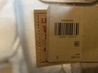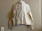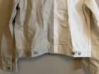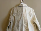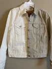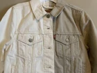 This Levi's denim jacket features a colorful block design in cream and khaki tones, with a button closure and long sleeves. The jacket is made from 100% cotton denim fabric and is perfect for all seasons. It has a collared neckline and is suitable for a variety of occasions, including travel, parties, casual wear, and formal events. The jacket is a size S and is part of the Levi's Trucker style. It has embroidered accents and the Levi's logo on the front pocket. The lining is made from 100% cotton and the jacket is dry clean only. This jacket is a classic piece with a school-themed twist, perfect for those who love colorful and classic styles.