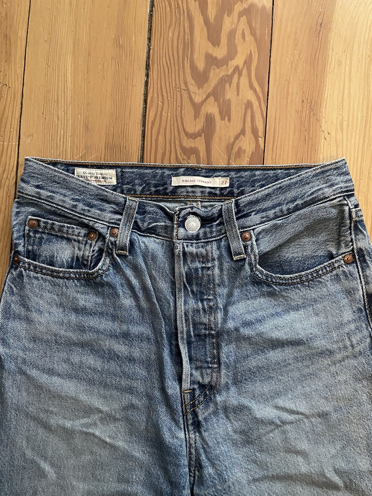 Levi’s premium ribcage straight leg jeans. Size 27” waist with 27” inseam. These are gently worn and show some wear but do not have any stains, holes or flaws. In great condition overall!