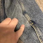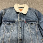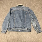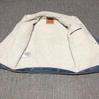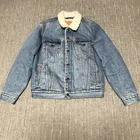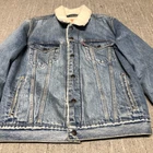 Levi’s Sherpa Lined Denim Trucker Jacket Men’s Size S Blue Stonewash Biker Retro Good condition Small stain on sleeve, and there’s a mark on the inner lining, but otherwise no major flaws. Measurements in pictures