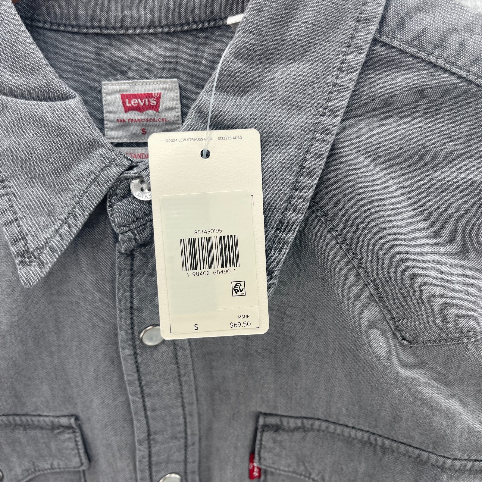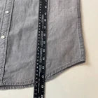 Levis Shirt Mens Small Gray Chambray Western Pearl Snap Yoke Cowboy Rodeo Work Measurements can be seen in the photos.