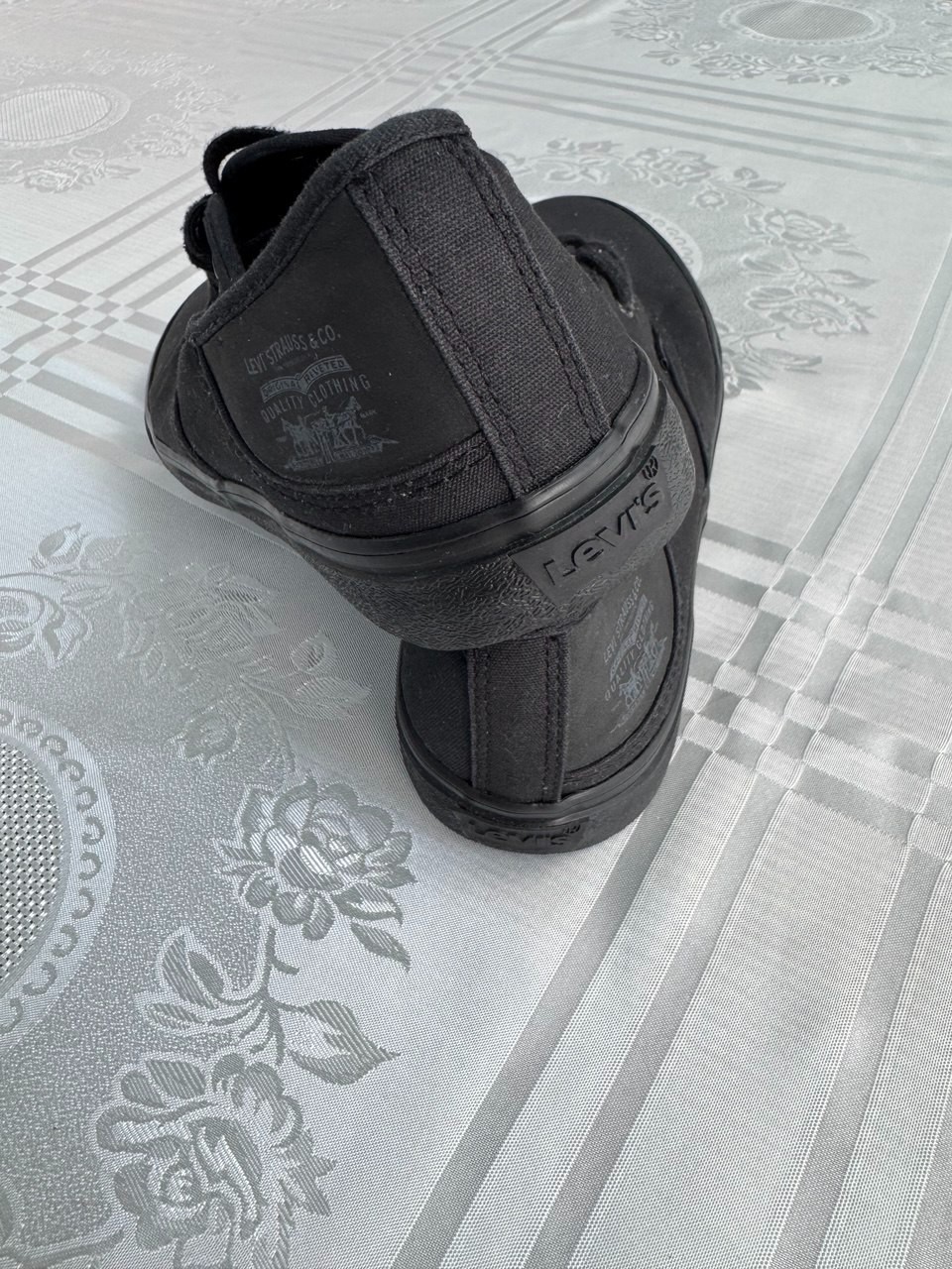 The product is a pair of Levi's men's shoes in size 8.5, specifically designed for casual wear. The shoes are black in color and feature a sneaker style, making them a versatile and comfortable choice for everyday use. Made with 100% cotton upper material, these shoes combine durability and style to provide a reliable option for men looking for quality footwear.