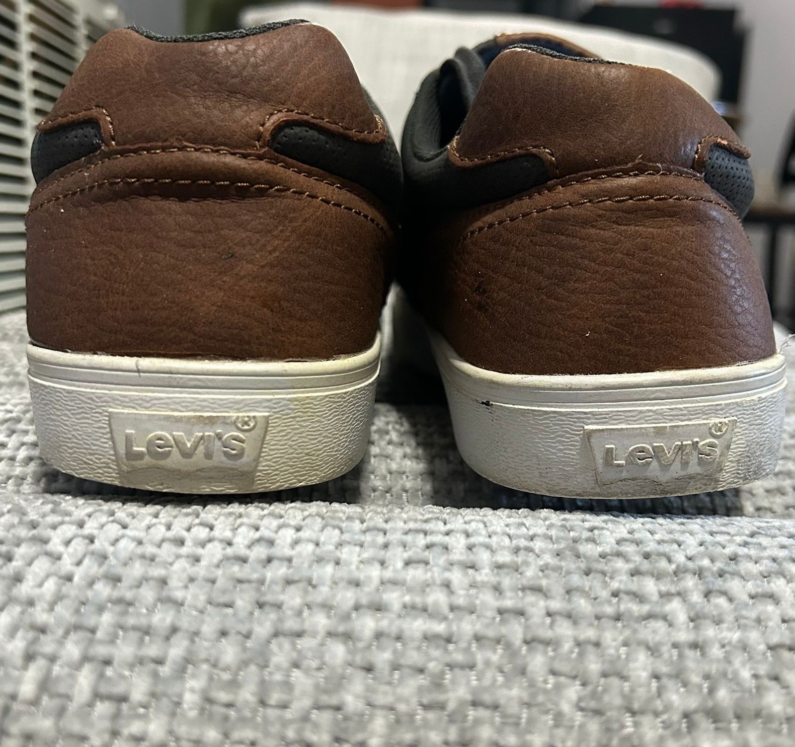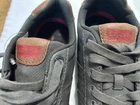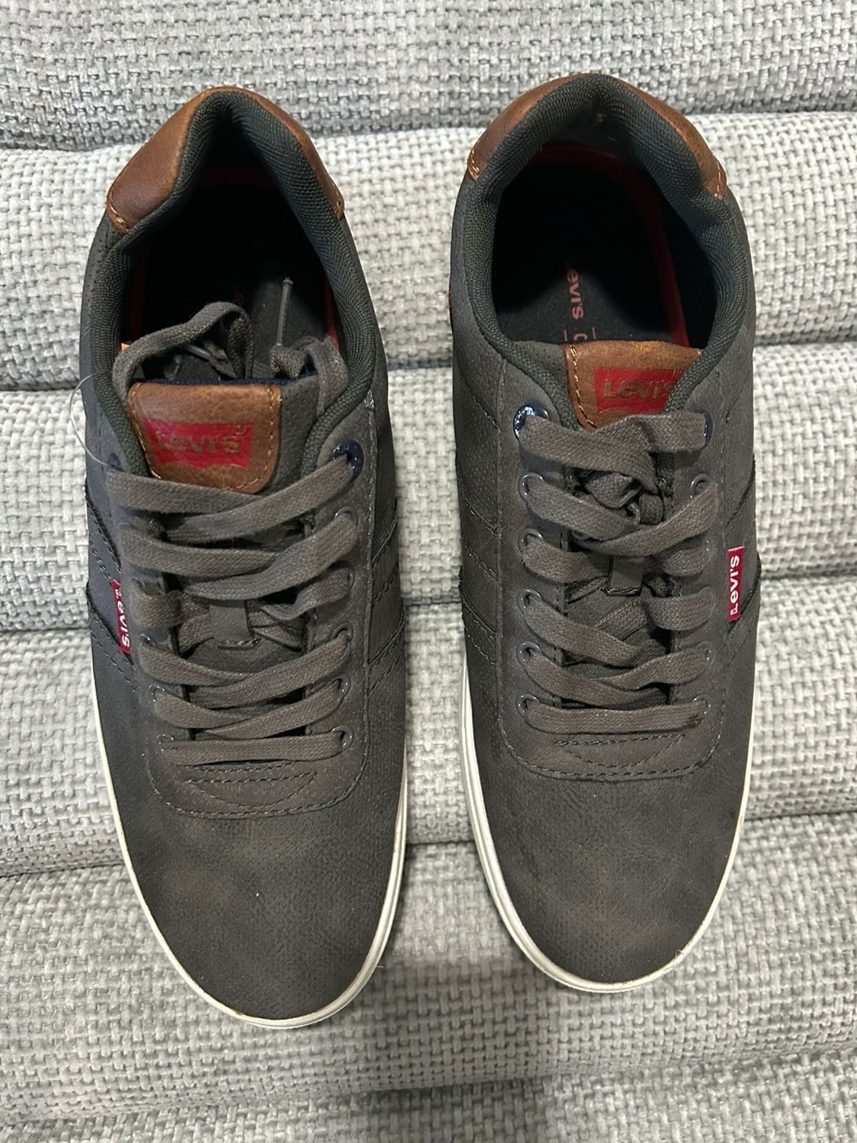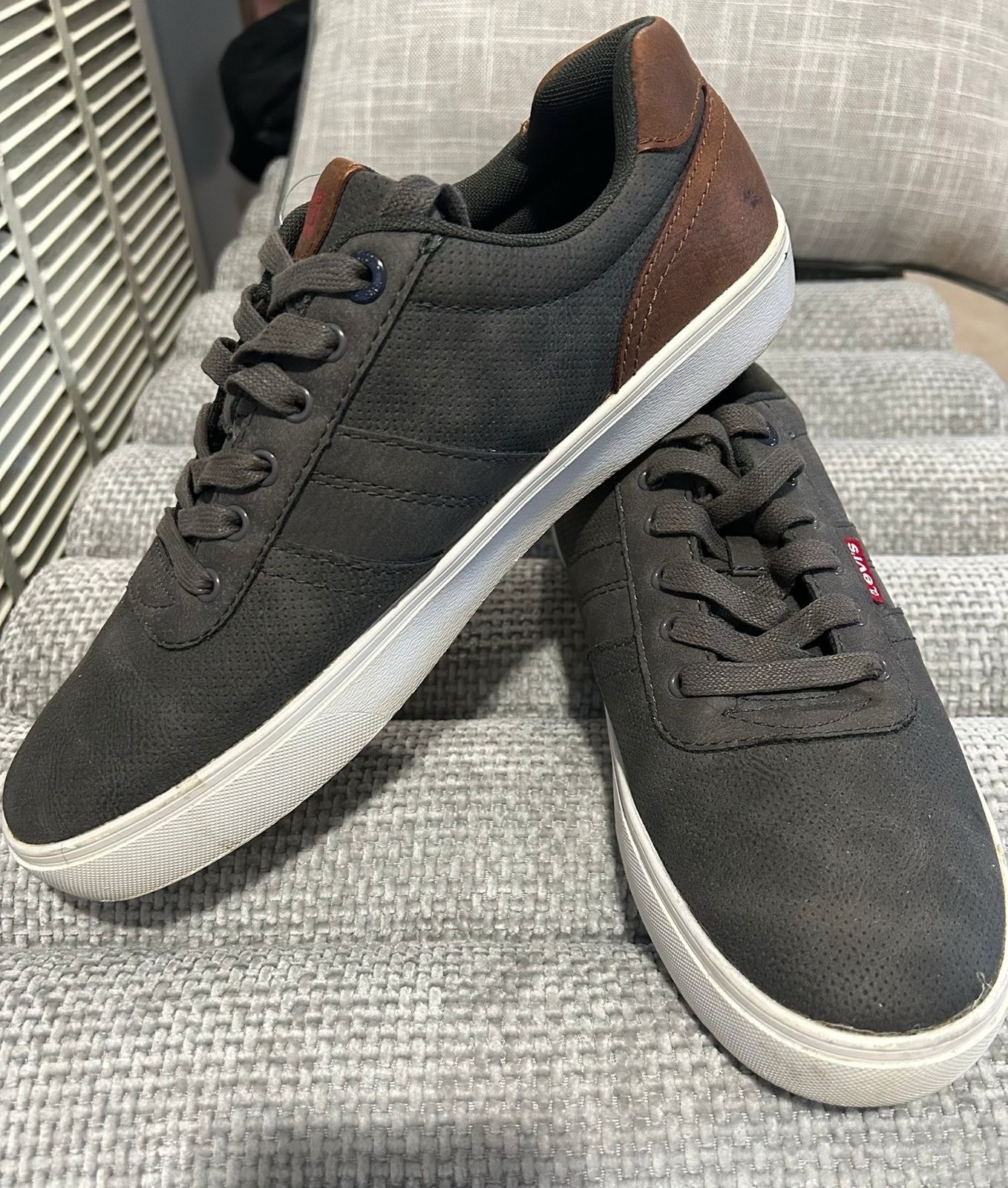Levi’s men’s low-top casual sneakers in size 9.5. Dark gray with brown heel accents and white rubber soles. • Very good pre-owned condition • Clean uppers and interiors • Light sole wear only (see photos) • No damage or odors Please review all photos for exact condition. Ships fast and securely.
