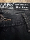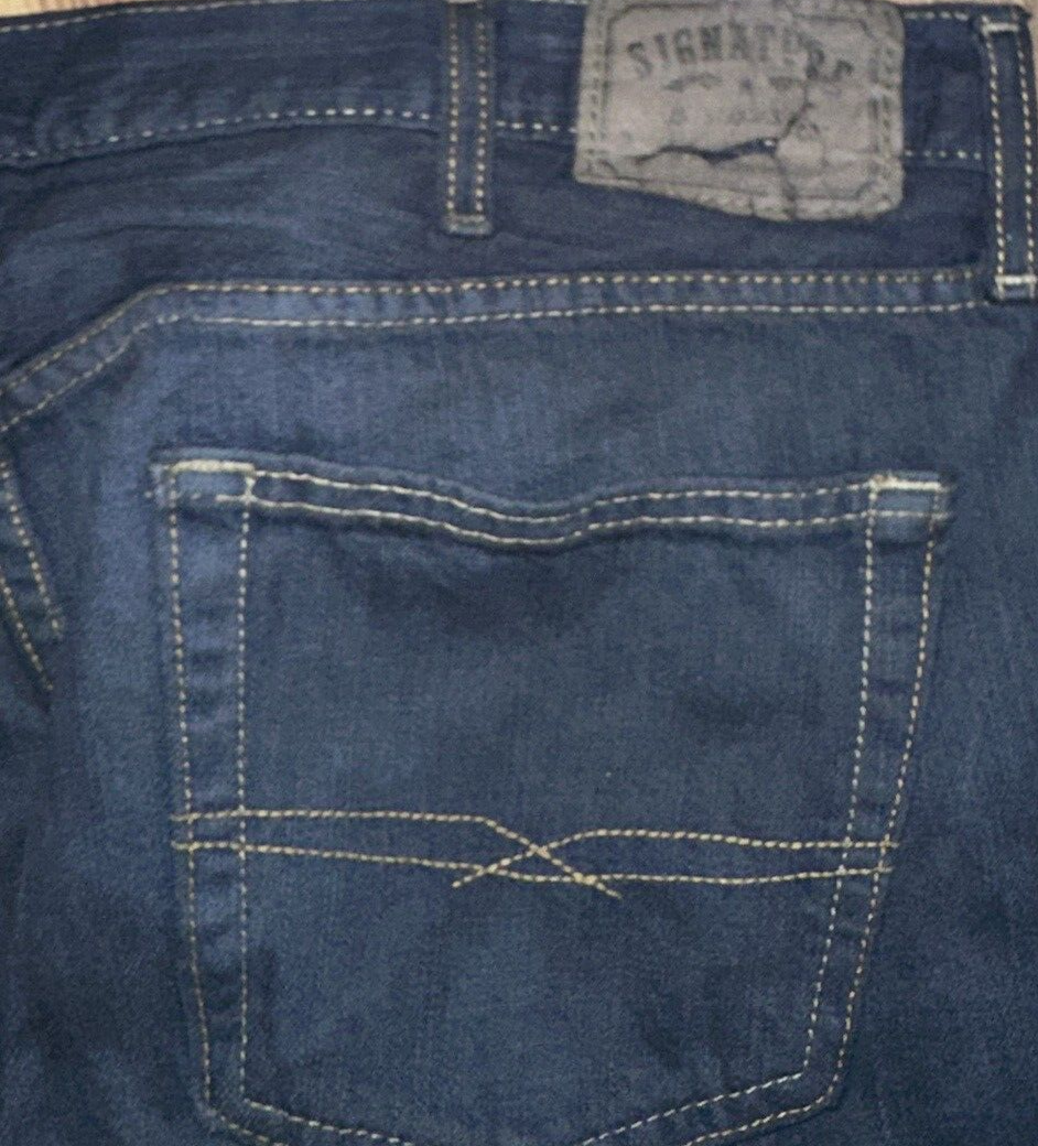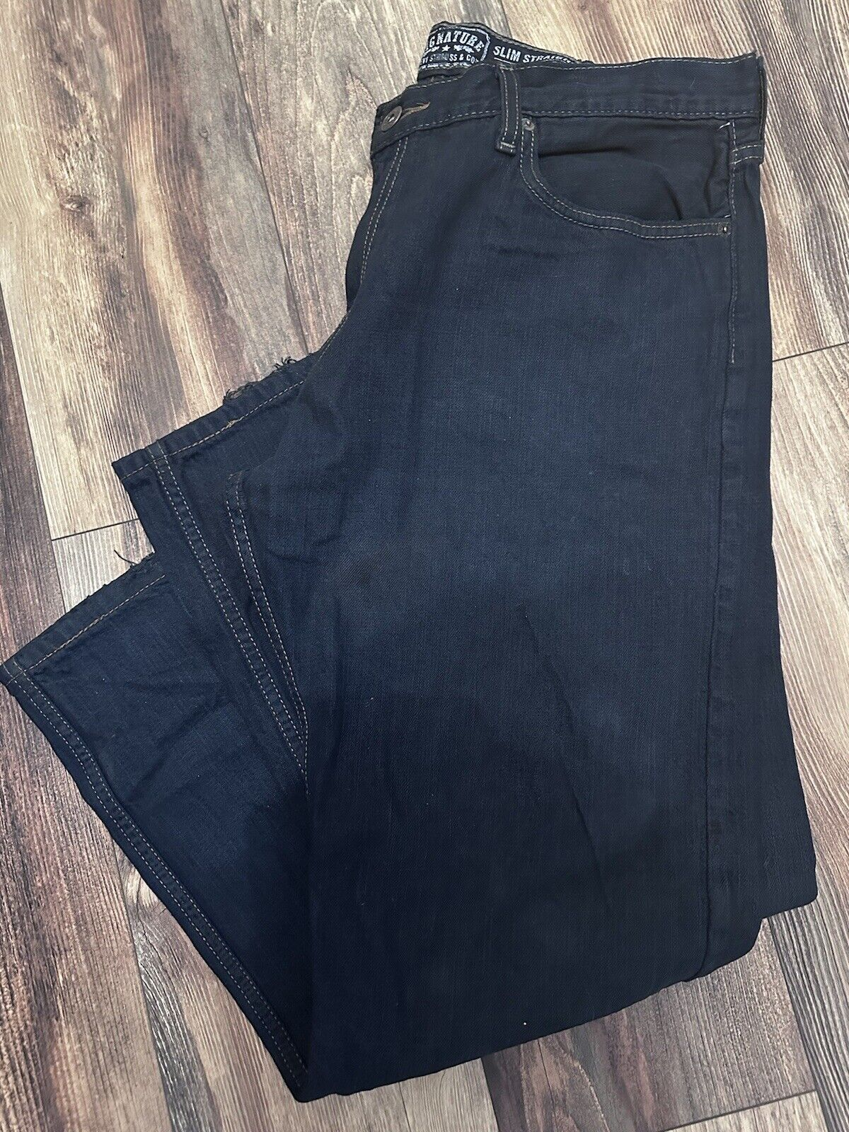 Get ready to ride the range in style with these Levi's Signature Series slim straight boot leg jeans. Made from comfortable and durable denim fabric in a dark wash, these jeans feature a 5-pocket design with button and zipper closures and the iconic Levi's logo on the back pocket. The slim fit and straight leg design provide both a stylish and comfortable look, while the easy care and machine washable fabric make them perfect for any season. These vintage-inspired jeans are perfect for any cowboy or western enthusiast, with a classic design that includes button accents, a zipper closure, and a slimming fit. The size 40 waist and 30 inseam make them a great fit for men of all sizes, while the solid blue color and Levi's brand ensure that you're getting a quality product. Whether you're riding the range or just looking for a stylish pair of jeans, these Levi's Signature Series jeans are the perfect choice. Smoke free home! READ! Measurements taken are 38/29