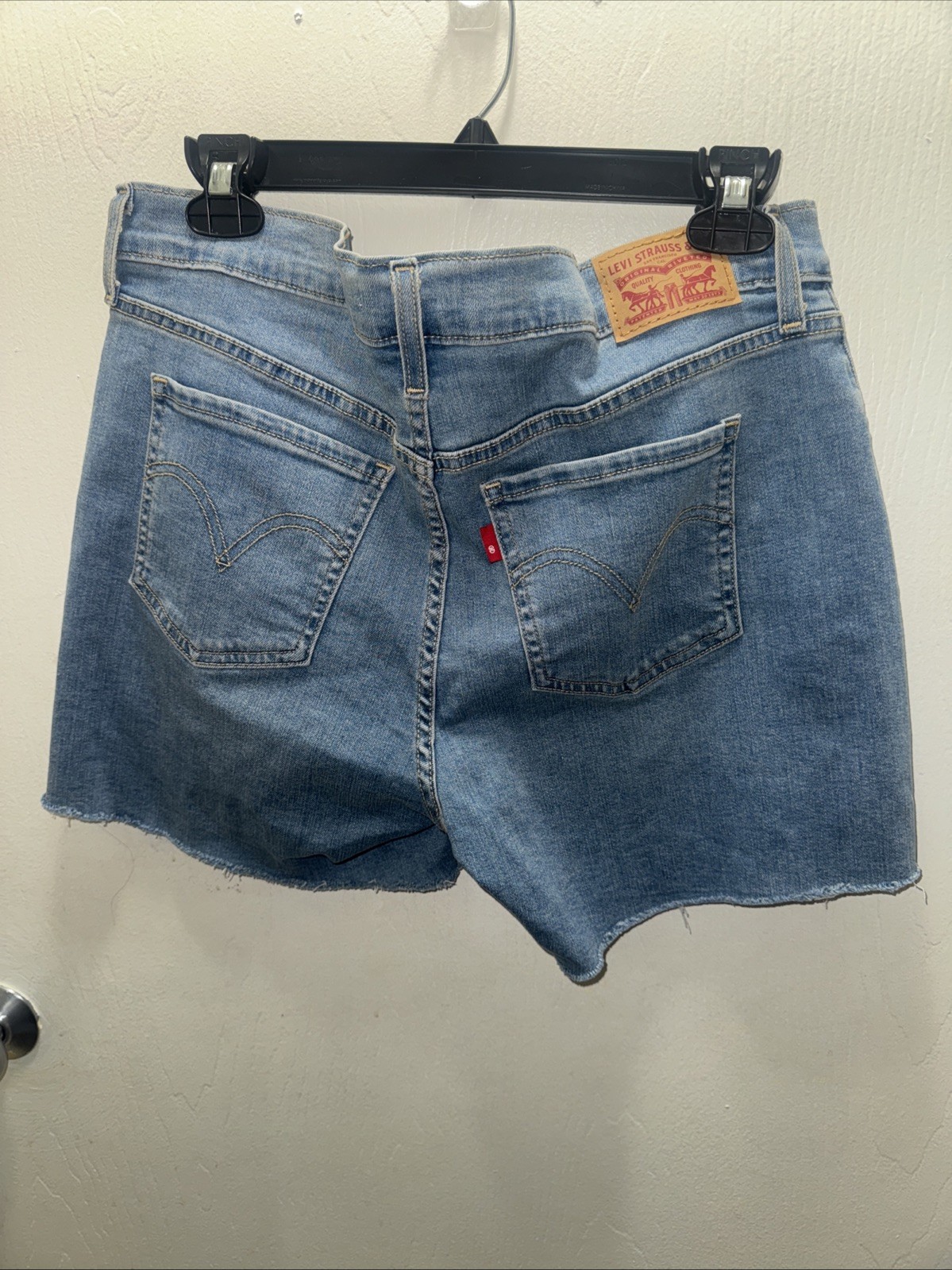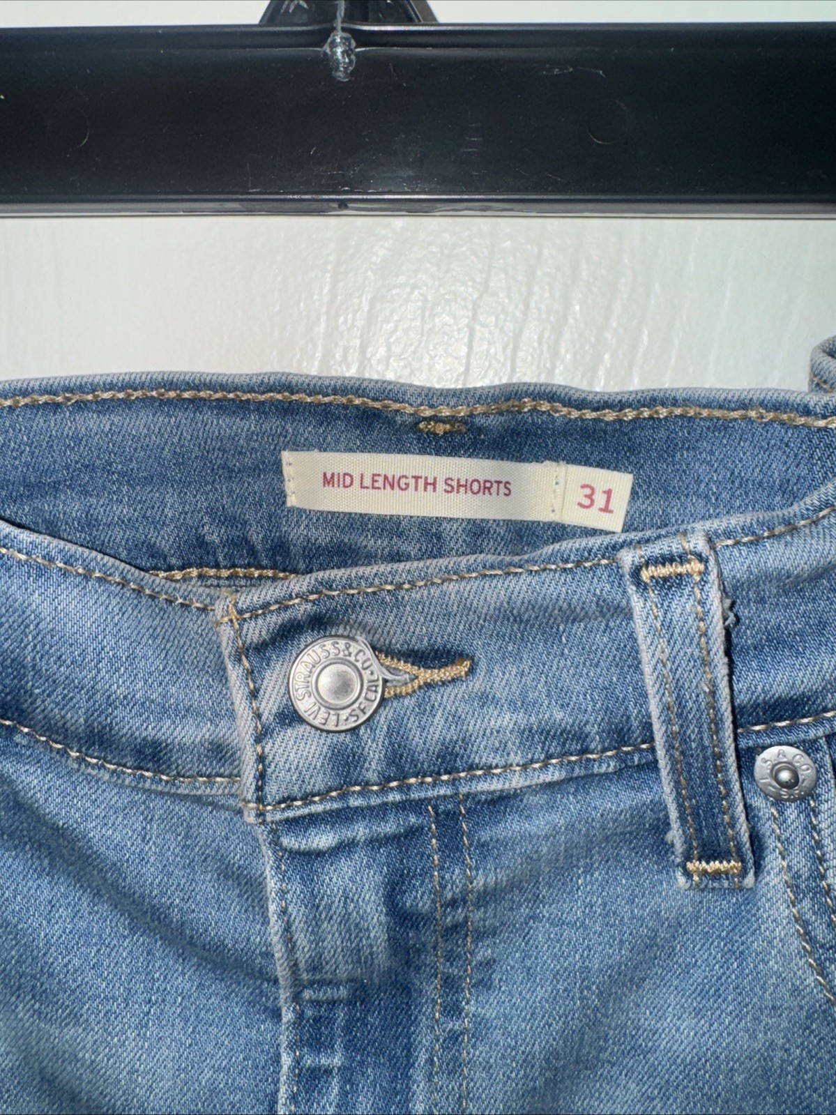 The Levi's Women's Mid-Length Blue Denim Shorts in size 31 are a classic and versatile wardrobe staple. Made from cotton denim, these shorts feature a flat front, zip closure, and a comfortable regular fit. The mid-rise waist and 5-pocket design add both style and functionality. Perfect for casual occasions during the warmer seasons of summer and spring, these shorts are easy to care for with machine washable fabric. The timeless blue color and Levi's branding make these shorts a must-have for any woman's closet.