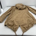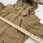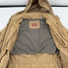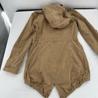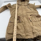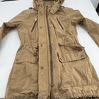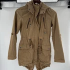 Embrace the classic military aesthetic with the Levi's Women's Tan Khaki Utility Jacket. Crafted from durable cotton canvas, this jacket is a versatile addition to any wardrobe, perfect for casual outings or travel adventures. The rich brown hue is easy to pair with a variety of outfits, making it a go-to for both fall and spring seasons.This mid-length jacket features a removable hood, full zip closure, and convenient zipped pockets, ensuring both style and functionality. The fishtail design adds a touch of sophistication, while the Levi's signature logo and button accents provide a timeless appeal. The long sleeves and polyester lining offer comfort during cooler weather. Machine washable for easy care, this jacket is as practical as it is stylish.