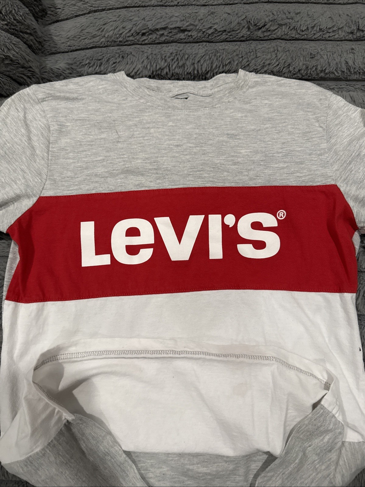The Levi's Youth Long Sleeve Block Graphic T-Shirt in Grey/Red/White, size XL 13-15 years, is a stylish and comfortable option for boys. Made from cotton, this pullover shirt features a crew neck and long sleeves, perfect for casual occasions during the summer, fall, and spring seasons. The shirt showcases a logo design and is machine washable for easy care. With a regular fit and basic style, this shirt is ideal for active boys attending school.