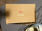 Step into comfort and style with the Levi's x Crocs Classic All-Terrain Clog in Sashiko Light Wash. This limited edition collaboration blends the iconic Crocs design with a fresh, colorful theme, featuring a classic check pattern and the timeless Levi's logo. Perfect for those who value both comfort and style, the clog's lightweight construction and cushioned insole make them ideal for any activity, from walking to gym training. Crafted with a durable rubber upper and designed for year-round wear, these clogs boast a low-top shaft for a casual fit and are equipped with an ankle strap to secure your feet. The versatile blue hue complements a range of outfits, making them a smart addition to any casual ensemble. Whether you're headed to school or enjoying the outdoors, these size 9 Crocs offer a fusion of functionality and fashion. Damaged Box but contains all 3 Jibbitz and wrapping paper inside.