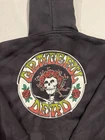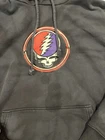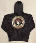 Levis x Grateful Dead Hoodie Sweatshirt Skull Rose Tie Dye Gray Pullover XS. Has a stain on front as pictured. This is a Levi's x Grateful Dead hoodie sweatshirt in size XS, featuring a skull and rose graphic print on a gray tie-dye fleece fabric. The hoodie has a drawstring closure, crew neck, long sleeves, and pockets. It is a relaxed fit with a hood and Levi's logo accent. This pullover is suitable for winter, fall, and spring seasons, and is machine washable.