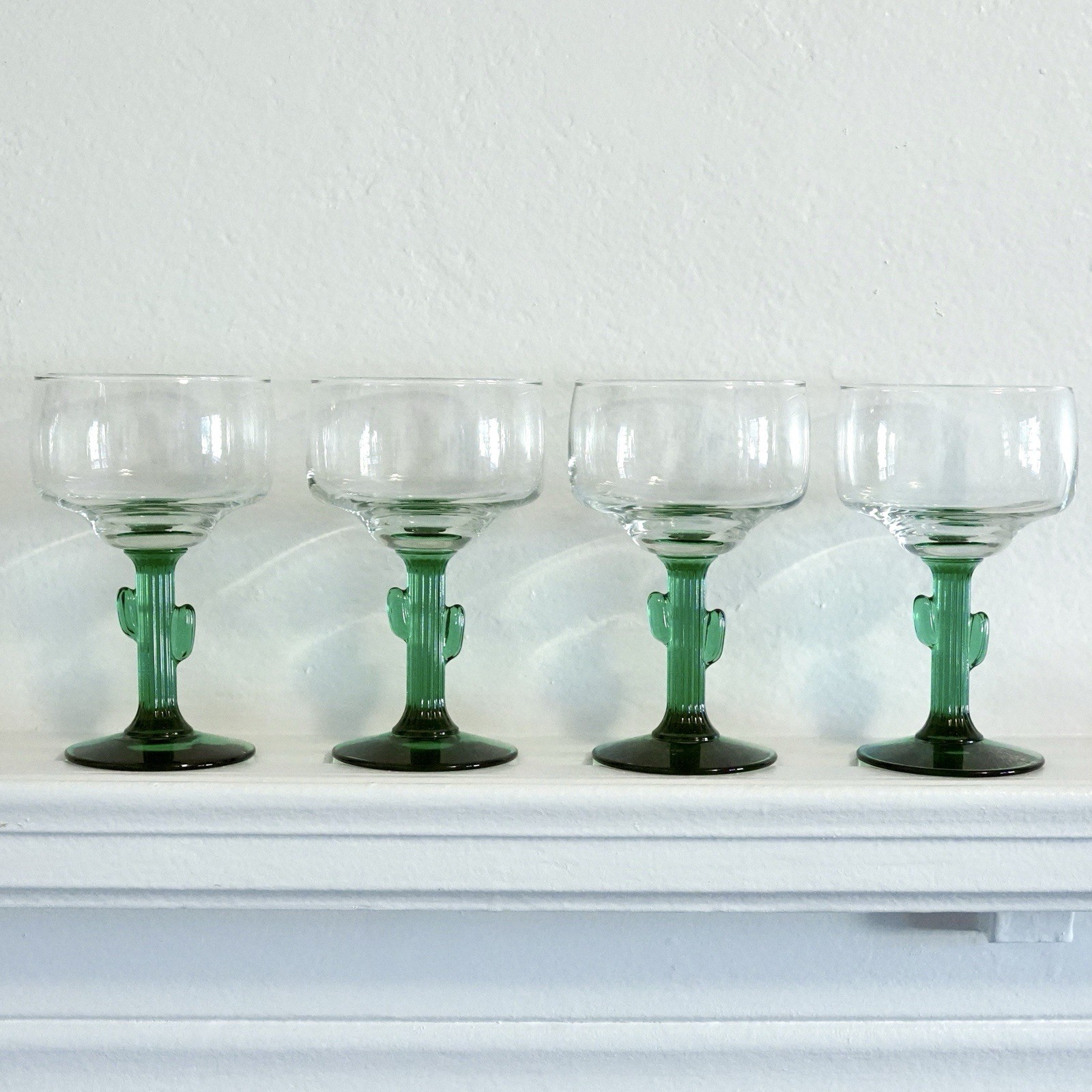 DESCRIPTION: The Libbey Set of 4 Margarita Glasses with Green Cactus Stems is a stylish and functional addition to any home bar or entertaining space. Each glass features a round shape and a capacity of 16 oz, making it perfect for serving up your favorite cocktails. Hand wash only to maintain the vibrant green color and decorated design, which adds a touch of sophistication to any occasion. Ideal for all occasions, this set is sure to impress guests and make drinkware a focal point in your home decor. No chips, cracks, or breaks. In used condition..