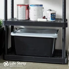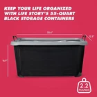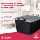 Life Story 6 Pack Heavy Duty Stackable Storage Bin, 55 Quart Home Organizer, Versatile Lightweight Locking Bins with Carrying Handles, Black/Gray Product Details Brand: Life Story Color: Black/Gray Material: Plastic Special Feature: Stackable Style: Modern Recommended Uses For Product: For Christmas Ornaments Product Dimensions: 23.6"L x 12.3"W x 16.9"H Capacity: 52.05 Liters Closure Type: Latch Water Resistance Level: Water Resistant Opening Mechanism: Snap Shape: Rectangular Pattern: Solid Number of Items: 6 Storage Volume: 52.05 Liters Number of Compartments: 1 Unit Count: 6.0 Count Item Package Quantity: 1 Assembly Instructions Description: No assembly required Manufacturer: Life Story Part Number: 77921 Is Discontinued By Manufacturer: No Size: 6 Number Of Pieces: 6 Special Features: Stackable Batteries Included?: No Batteries Required?: No Brand: Life Story Color: Black/Gray Material: Plastic Special Feature: Stackable Style: Modern Tidy Up in Style: Eliminate household clutter with the versatile heavy-duty storage container, perfect for organizing laundry, fun items, tools, and more throughout your home. Durable for Indoors & Outdoors: Built from sturdy, solid plastic that withstands frequent use in the garage, utility room, closet, or office without cracking or warping. Lightweight Stackable Design: Features a lightweight build with stackable functionality. Stack multiple bins to maximize vertical space and keep storage areas neat and efficient. Comfortable Soft-Grip Handles: Ergonomically designed handles make it easy to move your container from room to room with minimal effort. Functional Storage: Not only practical, the lidded containers offer a unique modern look that enhances your home décor while serving all your everyday storage needs.
