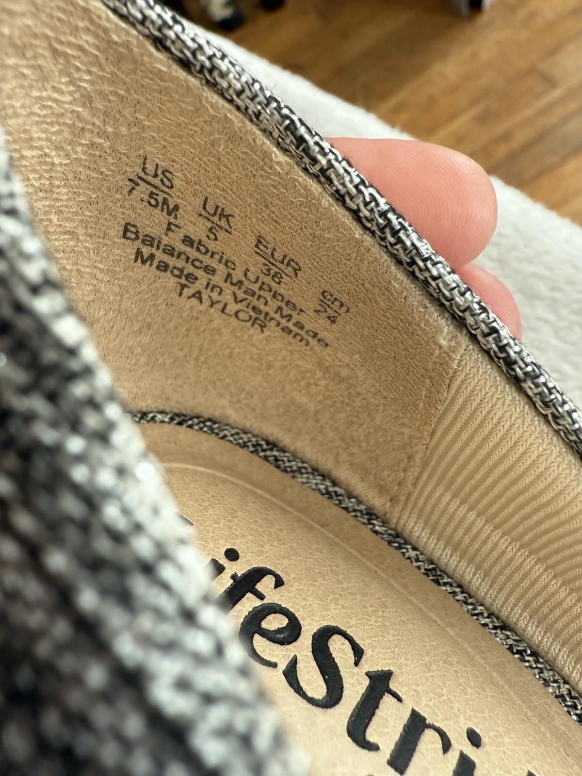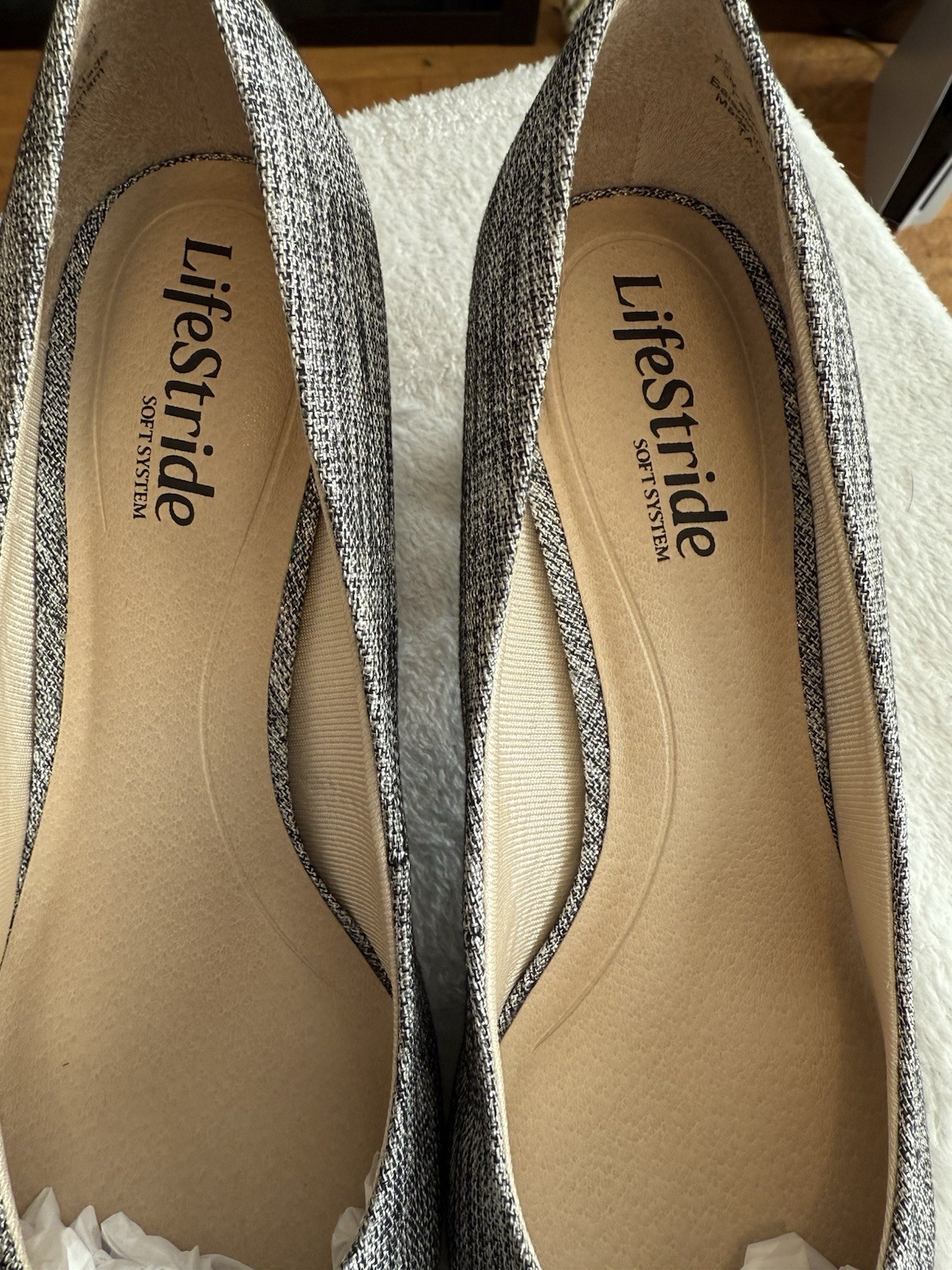 LifeStride Taylor pumps in women’s size 7.5 (EU 38), worn one time for a job interview and then returned to their original box. Originally $89 These shoes are in excellent, like-new condition with no visible wear. They feature a classic tweed-style fabric with subtle shimmering threads woven throughout. The shimmer is difficult to capture on camera but is noticeable in person, giving the shoes a polished, elevated look without being flashy. The comfortable block heel (approximately 2 3/8”) makes these ideal for business, office, or professional wear while still being easy to walk in. Details: • Brand: LifeStride • Style: Taylor Pumps • Women’s Size: 7.5 • EU Size: 38 • Heel Height: approx. 2 3/8” • Color/Material: Tweed-look fabric with subtle shimmer • Condition: Worn once, excellent condition • Includes: Original box and original packaging Perfect for business casual, interviews, office wear, or dressy everyday use. Please review photos carefully—they are part of the description. Ships promptly and carefully packed.