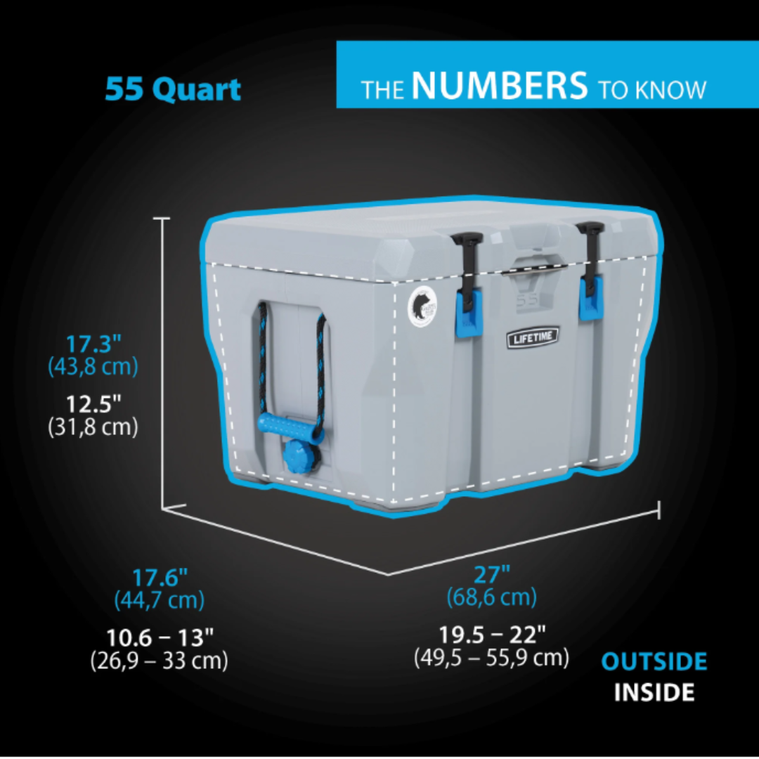 WE SHIP WITHIN 3-10 DAYS FROM USA We don’t ship items to PO box addresses, warehouse Free Shipping – Free Returns – Money Back Guarantee If you have any problem with the product, PLEASE contact me directly via eBay message, Please do not open a dispute because we cannot help if you open a dispute. Thank you very much! Lifetime 55qt Bear-Resistant Camping Cooler, Premium High Performance, Ice Retention, Hard Cooler, 60 Can Capacity, Light Gray About this item Product details The Lifetime New High-Performance Polyethylene Cooler is perfect for anywhere you want to go. Its performance exceeds most premium-priced coolers both in strength and in the all-important ice retention. With an insulated lid and body that provides strength, protection, and insulation, the Lifetime Cooler is light enough for everyday use, solid enough to keep your ice cold, and durable enough to go anywhere you go. With a 5-year warranty, up to 7 days ice retention, and room for 60 cans with ice, the Lifetime Cooler will more than stack up with the competition. Lifetime 55 Quart High Performance Cooler, 90949: Up To 7-Day Ice Retention Durable Stainless Steel Hinge Rod Dual Purpose Grip and Slide Feet Two Rubber Latches - Easily Opened with One Hand Easy-to-Drain Spout with Garden Hose Compatibility Stainless Steel Bottle Opener with Padlock Compatibility Heavy-Duty Polyethylene Construction Certified to Withstand a Bear For Up To an Hour Outside Dimensions: 27 in. L x 17.6 in. W x 17.3 in. H (68,6 cm L x 44,7 cm W x 43,8 cm H) Interior Dimensions: 19.5 - 22 in. L x 10.7 - 13.2 in. W x 12.5 in. H (49,5 - 55,9 cm x 27,3 - 33,6 cm x 31,7 cm) Volume: 55 quart (52,05 Liters) Weight: 23.4 lb. (10,6 kg) Ice RetentionUp To 7 Days Can Capacity: 60 Cans Warranty: 5 Year Limited info: Specifications Features No features description available Assembled Product Dimensions (L x W x H) 27.00 x 17.60 x 17.30 in