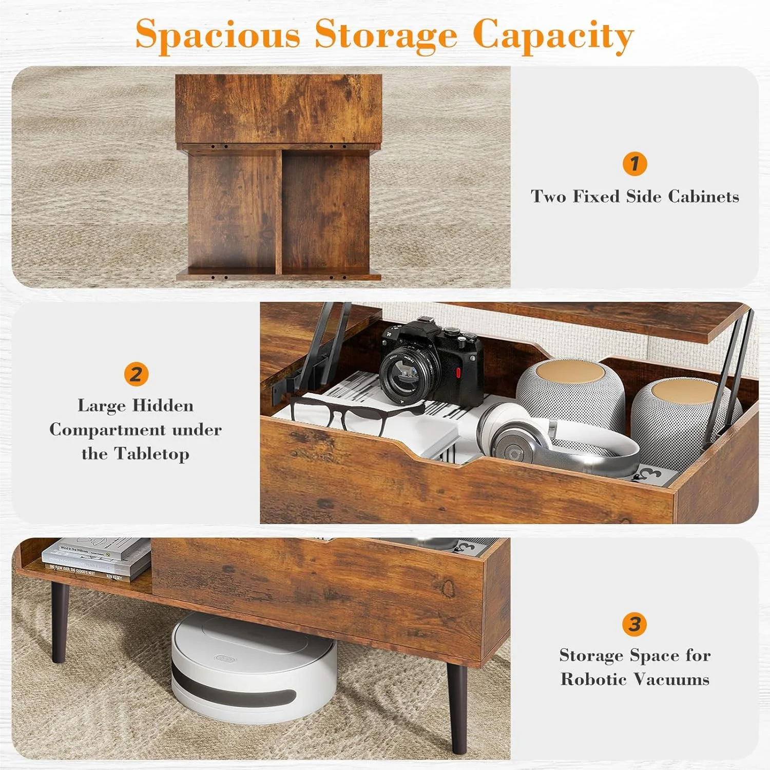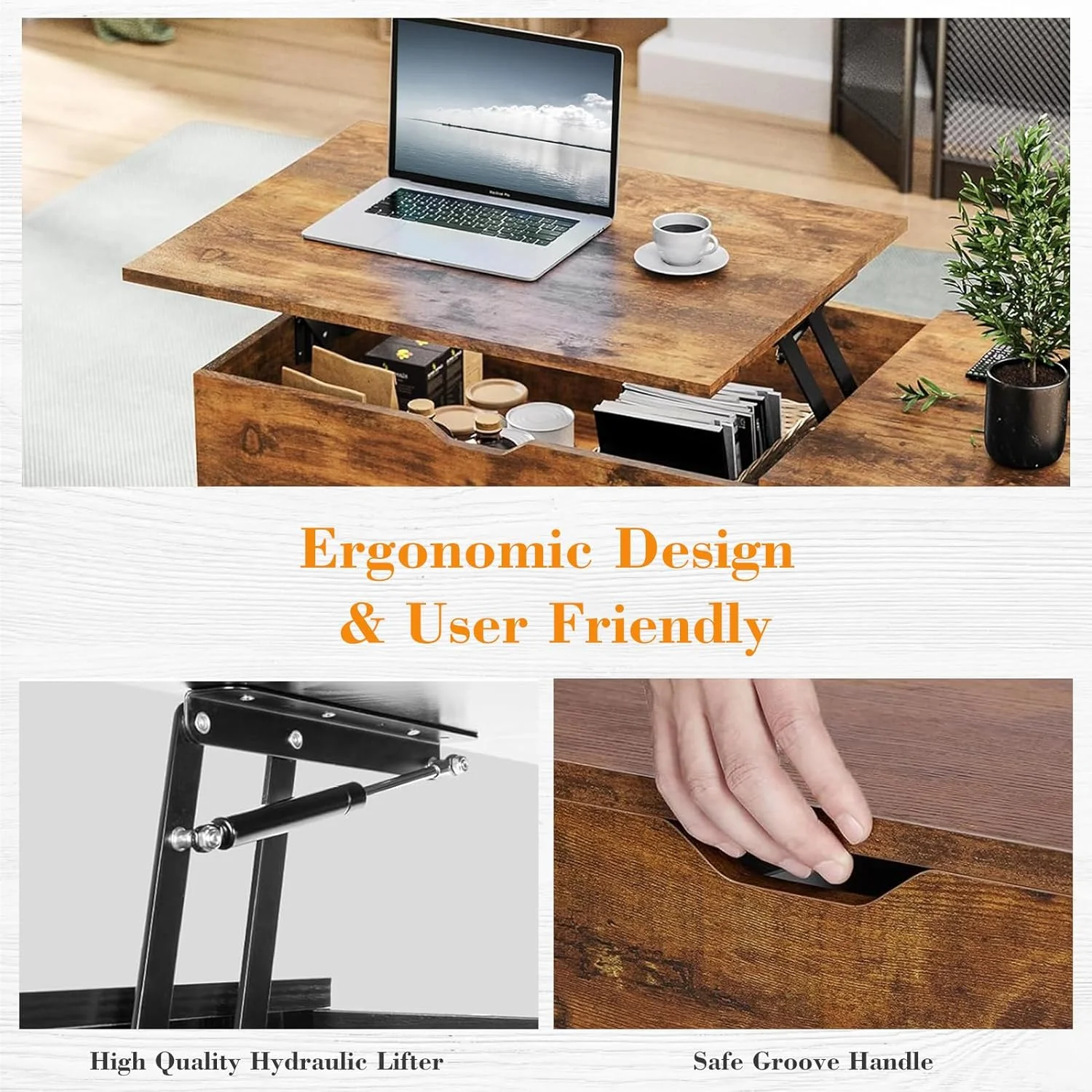 This living room lift coffee table is an excellent choice in modern home design, combining beauty and practicality. The table is made of high-quality wood, showing natural wood grain and modern minimalist style. Its unique lifting design allows the tabletop to adjust the height as needed, so as to adapt to different usage scenarios, whether it is used as an ordinary coffee table or a workbench. In addition, this coffee table is equipped with cleverly designed storage shelves and hidden compartments, providing you with additional storage space. The storage shelf can be used to place books, decorations or other daily necessities, while the hidden compartment can store remote controls, magazines or small items to keep your living room tidy and organized. The overall design takes into account practicality and fashion, making this coffee table not only a practical piece of furniture, but also a highlight of the living room. Whether it is a modern, simple or classic style home, it can be easily integrated into it, adding elegance and convenience to your living space. Flexible height adjustment: The lifting function allows you to adjust the height of the tabletop as needed to adapt to different usage scenarios. Whether you are sitting on the sofa drinking coffee, or working or dining at the table, you can easily adjust to the right height to improve the comfort of use. Space Saving: The lifting design and compact size make this coffee table an effective space-saving option in a small living room. It can be folded up when not in use to make the space appear more spacious. Extra Storage: Equipped with storage shelves and hidden compartments, it provides additional storage space. The storage shelves are suitable for commonly used items such as books and decorations, while the hidden compartments are ideal for storing remote controls, magazines or other small items, helping to keep the living room neat and organized. Modern Design: The simple modern wooden design is suitable for various home styles, adding a sense of style and elegance to the living room. The texture and color of natural wood also bring a natural beauty, enhancing the overall decoration style. Durability: The use of high-quality wood not only enhances the stability and durability of the table, but also ensures its stability and reliability in long-term use. Wooden furniture is usually more wear-resistant and has a longer lifespan than other materials. Easy to Clean: The wood surface is usually smooth and simple to clean and maintain. Just wipe it with a clean cloth regularly to maintain its appearance. Versatility: This coffee table can not only be used as a traditional coffee table, but also can be adjusted to the height as needed to use it as a work table or dining table. Its versatility allows it to function in different living scenarios, increasing the flexibility of the home.