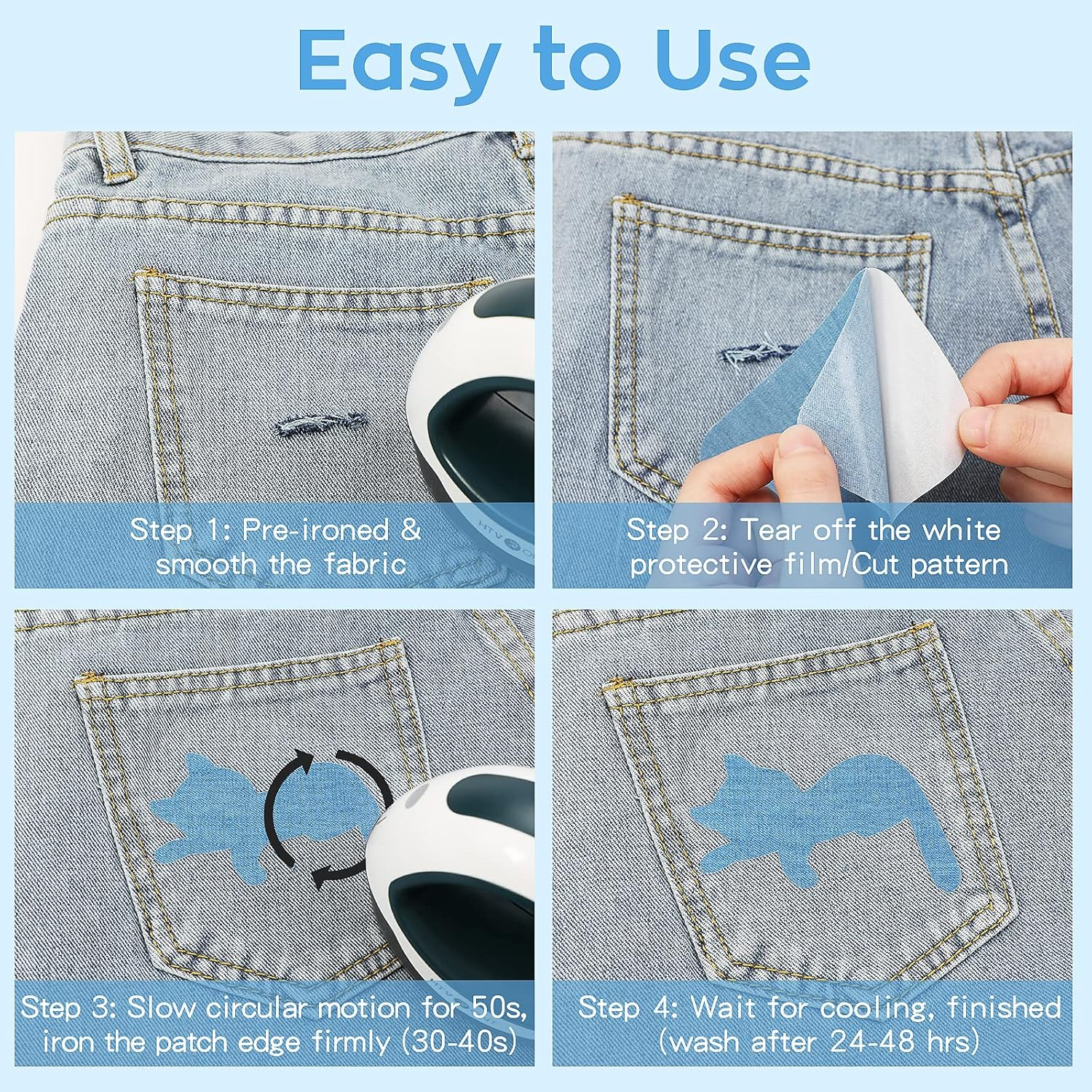 【GREAT STICKINESS & DURABLE】: Our iron on patches is soft and made of cotton. 30% more glue than other iron on patches for clothing, which could be machine washed and makes it through multiple washes, still remains its strongness and durability. Perfectly merged with your restored items without any falling off and fading after washing. 【NO RESIDUE & BAD SMELL】 Using a scissors to cut the size or shape you need to repair. Place the jean patches for clothing on the garment with iron for heavy pressure or heat press for middle presure. Only few minutes will take for inside & outside reinforced. Simply reironed the corners to make the iron on patch firm and no residue left. 【WIDE APPLICATIONS】 Iron on jean patches are ideal for the weak spot on the garments as well create different dress styles. Iron on patches for clothing repair can not only be applied on clothes, but also t-shirts, hats, shoes, socks and so on. Restoring the holes or worn out could prolong the life of the clothes and make you look more unique. 【DIMENSIONS & COLORS】Our size of denim patches inside jeans: 20 pack-3" by 4.25" will help to hide the shortcomings of both small and large holes and enough to create your own design. Iron on patches for jeans are able to almost perfectly match your clothes. The free sewing kit is included for ensuring the bond firm. 【EASY TO APPLY】You could use this patches for clothes to decorate, repair and reinforce the garments. The clothing patches could directly be cut into the shape and pattern you want. CAUTION: pay more attention on the edges avoiding curling when applying the jean patch. Please feel free to contact us if you are not 100% satisfied with patches iron on. Product Description HTVRONT 20 Pack Iron On Patches Free sewing kit we provided to help you makes the bond firm. Our iron on patches is made of highest quality fabrics,and the glue of our denim iron on patches are 30% more than others. You can design your personalized patterns, cut the jean patches into the shapes you want to patch or decorate your clothes to make your clothes unique. Pre-ironed and smooth Tear off the protective film Iron the patch firmly Wait for cooling 1 High Quality Fabric 2 Free Sewing Kit 3 Great Stickiness 4 Machine Washable Multiple products for you to choose from Add to Cart Add to Cart Add to Cart Add to Cart Add to Cart Add to Cart Add to Cart Customer Reviews 4.3 out of 5 stars 19,822 4.4 out of 5 stars 2,559 4.4 out of 5 stars 1,328 4.1 out of 5 stars 442 4.7 out of 5 stars 5,395 4.7 out of 5 stars 5,395 4.4 out of 5 stars 2,559 Price $5.99 $ 5 . 99 $7.29 $ 7 . 29 $7.99 $ 7 . 99 $7.99 $ 7 . 99 $34.99 $ 34 . 99 $34.99 $ 34 . 99 $13.69 $ 13 . 69 CATEGORY Iron on patches Iron on patches Iron on patches Iron on patches Small Heat Press Machine Heat Press Machine Iron on Patches COLOR Four colors Multi-color Rainbow color Four colors Mint Green Mint Green Four colors SIZE 20pack Cotton-3"x4-1/4" 20pack Cotton-3.7"x4.9" 20pack Cotton-3.7"x4.9" 4rolls Cotton-4x20" 93 / 100 4.34" x 4.13" 23 10" x 10" 3" x 60" APPLY TO Clothes,trousers,bags,jean, Clothes,trousers,bags,jean, Clothes,trousers,bags,jean, Clothes,trousers,bags,jean, For heat transfer materials For heat transfer materials Clothes,trousers,bags,jean, ADVANTAGE Easy to Apply Easy to Apply Easy to Apply Easy to Apply Safe Use Safe Use Easy to Apply