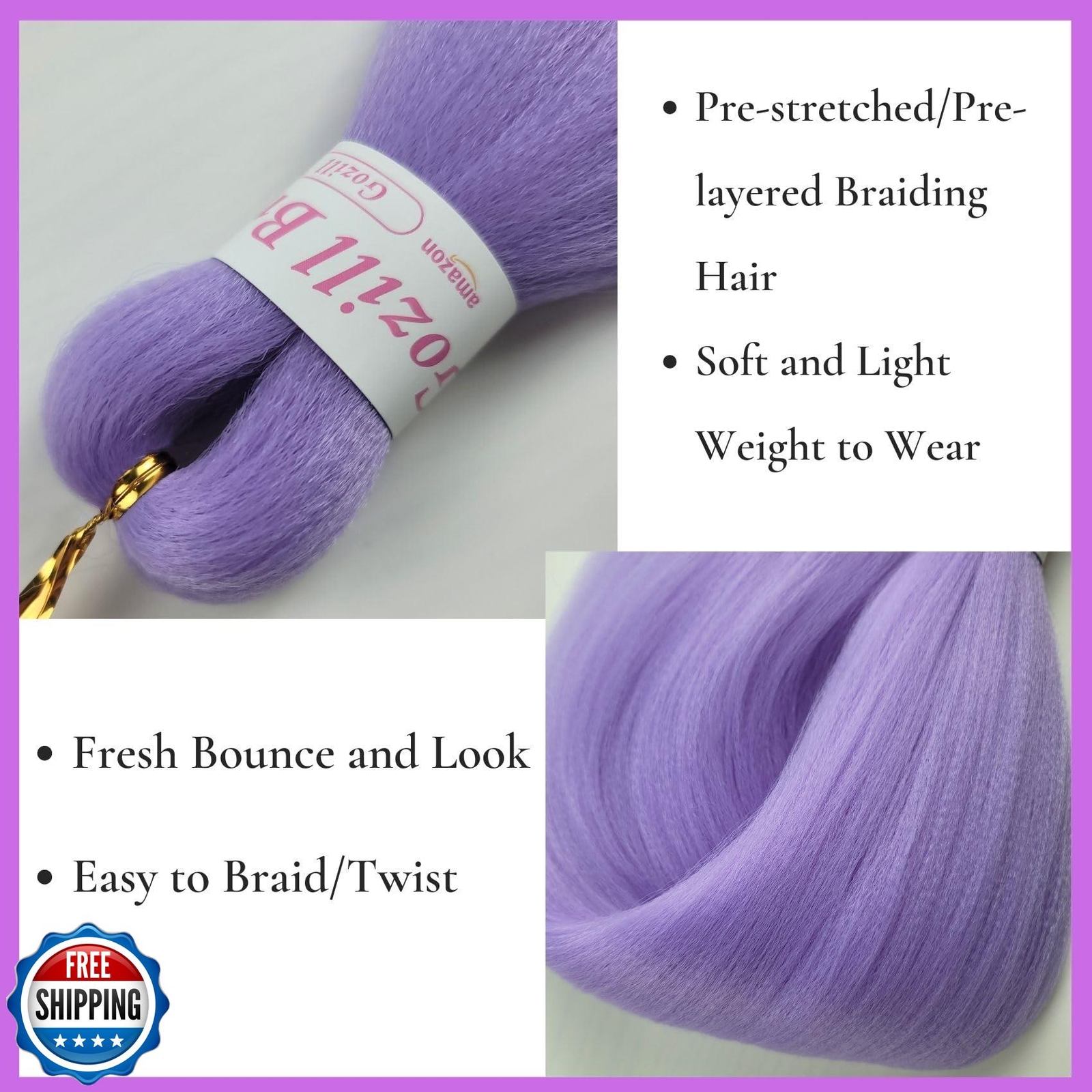 Light Purple Boho Braiding Hair Pre Stretched Knotless Boho Braids Hair Synthetic Deep Wave Crochet Hair for Women(6 Packs) Features Light Purple Boho Braiding Hair, There are 5 Packs Pre Stretched Braiding Hair and 1 Pack Deep Wave Boho Braiding Hair , Total 6 Packs Hair in One Package. The Synthetic Boho Hair Is Made With Quality Low Temperature Fibers, No Weft, Soft to Braid The Boho Braiding Hair Is Soft and Natural, Light Weight to Wear, the Colour Is Fade-resistant and Long-Lasting, Help You Get Charming Boho Braids Look Easily. Easy to Manage, Easy to Braid, Perfect for DIY Boho Braids, Goddess Braids,Knotless Box Braids, Ghana Braids or Creating Intricate or Elaborate Braided Styles. You Will Feel Amazing with the Gozill Synthetic Boho Braiding Hair Set, Try It Now Shipping Free & Fast Shipping: We offer free shipping to most of the USA with a normal delivery time of 3-7 days. However, due to the current situation, additional delivery time (up to 3 weeks) may be required for some items. Alternative Carriers: We may use alternative carriers (e.g., USPS, FedEx, UPS) to ensure your package arrives safely and on time. Due to the use of multiple carriers, we are unable to provide a tracking number automatically. Handling Time: Orders are processed and shipped within 1-2 business days of receiving cleared payment. Shipping Restrictions: Shipping to Alaska, Hawaii, Puerto Rico, Guam, and other US territories may incur shipping charges or delivery restrictions. Please contact us before ordering, or your order can be refunded/cancelled. State Restrictions: Certain items may not be shipped to California due to state regulations. Contact for Tracking Updates: If you require tracking updates or have any concerns about the delivery of your order, please feel free to contact us, and we will be happy to assist you. Return Policy 30-Day Hassle-Free Returns: If you are not completely satisfied with your purchase, you can return the item for free within 30 days of receiving it for a full refund or exchange. Easy Return Process: Contact us, and we will provide you with a prepaid return shipping label and detailed instructions. No Restocking Fee: There are no restocking fees for returns. However, the buyer is responsible for return shipping costs if the return is not due to a seller"s error. Refund Processing: Refunds will be processed within 1 business day of receiving the returned item in its original condition. Feedback Your feedback is extremely important to us. We strive to provide the best products and customer service possible. If you are satisfied with your purchase, please take a moment to leave us a positive review. If you have any concerns or issues with your order, please contact us before leaving negative feedback. We are committed to resolving any problems and ensuring your satisfaction. Contact Us If you have any questions or concerns, please feel free to reach out to our customer support team. You can contact us through the eBay messaging system. We are available Monday to Friday, 9:00 am to 5:00 pm EST, and we will do our best to respond to your inquiry within 24 hours. Thank you for supporting our small family business!