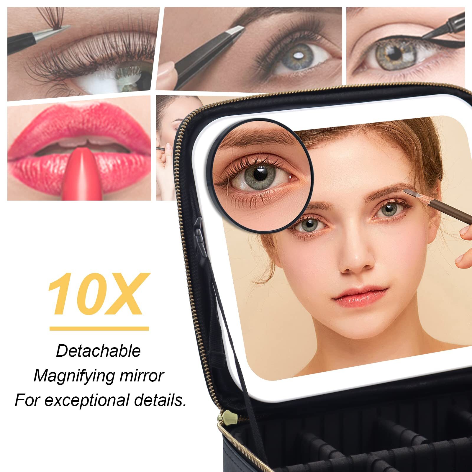 Jadazror Makeup Case, Lighted Mirror, Travel, Waterproof, Brown 【Revolutionary Travel Companion】Large capacity cosmetic storage compartment, large makeup brush storage board, no dazzling high-definition makeup mirror, with 3 color adjustable lighting modes, giving you the freedom to make up comfortably whenever wherever. Jadazror makeup bag with mirror and lights is the perfect for travel. 【Makeup Mirror with Fill Light】Travel makeup bag includes a 9.06*7.88 inch full-screen light mirror. Long press the switch to adjust light brightness from 0% to 100%, and gently touch the switch to easily adjust color temperature between cold light, natural light and warm light. Built-in 2000mAh rechargeable lithium battery, according to the daily makeup time of 30 minutes, a single charge will last about a week. 【Partitionable Portable Dresser】Lighted makeup case upgraded storage space(10.63*9.45*4.33 inch), hard partitions and lined surface can well fixed and protect the cosmetics inside. 6 adjustable EVA dividers, 10 makeup brushes slots, enough to DIY layout as needed to fit lipstick,eye shadow,brush and other cosmetics. And the adjustable strap can control multiple angle mirror for easy makeup. 【10X Magnifying Mirror As a Gift】The detachable 3.5 inch 10X magnifying mirror comes with our makeup organizer bag which works excellent for applying eyeliner or mascara, lining and defining the eyebrows, putting on contact lenses, and other beauty and skincare needs. You can see the face for every detail so that you can enjoy meticulous makeup. A must have for travel or business trips. 【Durable Leather Material】Makeup case with mirror is made of premium synthetic PU leather fabric, waterproof, shockproof, dustproof and easy to wipe clean. Double zippers are controlled by high standards from chain cloth selection, sprocket arrangement, polishing, electroplating, and subsequent oil sealing and waxing processes to ensure smoother pulling. This cosmetic case is also the perfect choice as gifts. SHIPPING Domestic Buyers - We have confidence in our products, but if you are not fully satisfied please contact us within 30 days of purchase and you will get full refund. - We ship within 3 business days of payment, usually sooner - We offer FREE shipping on all orders! - We only ship to the lower 48 states, no APO/FPO addresses or PO Boxes allowed International buyers – please note: Import duties, taxes, and charges aren't included in the item price or postage cost. These charges are the buyer's responsibility. - Please check with your country's customs office to determine what these additional costs will be prior to bidding or buying. * Order Cancellation Policy ** You can return a product for up to 30 days from the date you purchased it. 1. The seller reserves the right to cancel the special case only due to eBay cancellation fee. 2. The decision of seller is the final. 3. The seller will respond to the cancellation request within 2 business days. Please wait for the result of cancellation. 4. In case the cancellation is not completed by some reasons, the buyer can follow the options below to get the refund. 4.1 The buyer can reject the item when it arrives. 4.2 The buyer can send the item back to the seller within 30 days If the buyer receives item (USA Shipment ONLY). The seller will provide the FREE return label to the buyer when the buyer opens " Return Item" case on eBay by using the reason as "Change my mind" ONLY. 5. When buyer has placed the order. The order will be processed and completed by automatic warehouse system within 5 minutes. In case that buyer sends the cancellation request after 5 minutes of placing the order, the request will be rejected. **Sending direct message to cancel the order is not allowed for every case.* Return Policy For the return case - If buyer would like to return the items for refund or replacement, please CONTACT SELLER to receive the free return label from seller. The refund or replacement will be processed with the tracking number of return label which is provided by seller only. The other ways of return which are not approved by seller will not be processed for the refund or replacement.