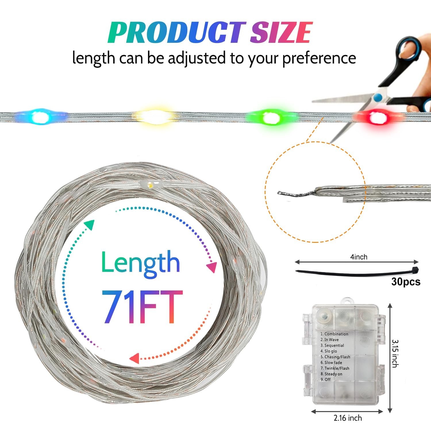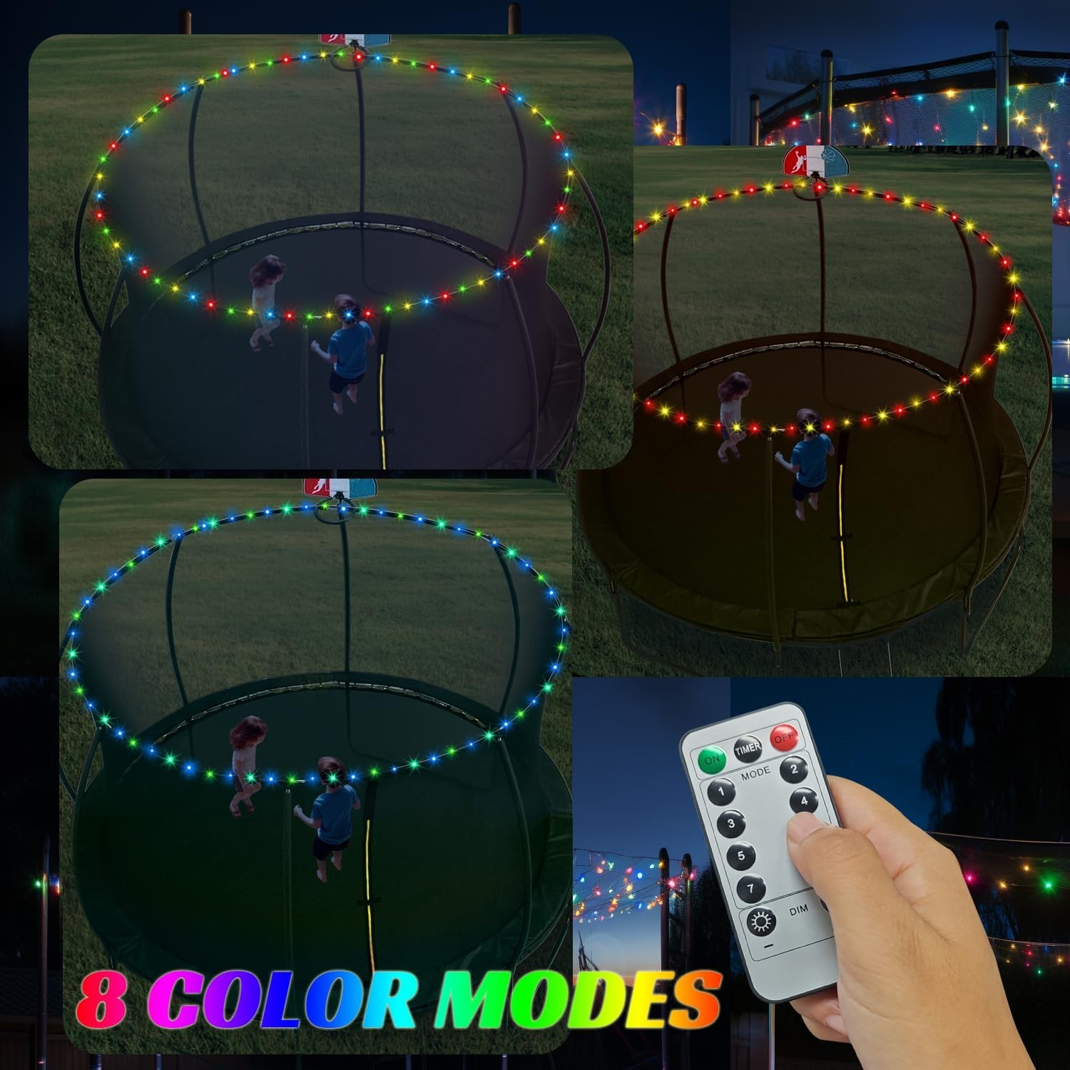Lights for 16ft Trampoline, 71Ft Battery Operated Lights Waterproof Outdoor, 200 LEDs and 8 Modes Camping String Light, Adjustable Length Rope Light for 16Ft/15Ft/14Ft/12Ft Trampolines Product Details Color: clear colour Brand: steelway Indoor/Outdoor Usage: Outdoor Special Feature: Waterproof Light Source Type: LED Power Source: batteries Light Color: Multicolor Theme: Mascots Occasion: Christmas Style: All-season Product Dimensions : 852 x 2.5 x 0.78 inches; 8.78 ounces Item model number : rope lights0001 Date First Available : September 14, 2023 Manufacturer : Steelway Customer Reviews: 4.2 4.2 out of 5 stars 15 ratings Color: clear colour Brand: steelway Indoor/Outdoor Usage: Outdoor Special Feature: Waterproof Light Source Type: LED Power Source: batteries Light Color: Multicolor Theme: Mascots Occasion: Christmas Style: All-season Material: Copper Controller Type: Remote Control Connectivity Protocol: USB Connectivity Technology: USB Number of Light Sources: 200 Wattage: 3 watts Included Components: instruction Number of Items: 1 Item dimensions L x W x H: 852 x 2.5 x 0.78 inches Control Method: Remote Water Resistance Level: Waterproof Seasons: All Seasons UPC: 717021038799 Form Factor: Rope or string Manufacturer: Steelway Part Number: rope lights0001 Item Weight: 8.8 ounces Product Dimensions: 852 x 2.5 x 0.78 inches Item model number: rope lights0001 Assembled Height: 0.78 inches Assembled Length: 71 Feet Assembled Width: 2.5 inches Shape: string Specific Uses: battery powered string lights,trampoline toys Special Features: Waterproof Switch Installation Type: Twist Batteries Included?: No Batteries Required?: No Date First Available: September 14, 2023 PORTABLE ROPE LIGHT - Battery Led Rope Light is powered by 3 AA batteries (not included), portable and stable, easy to assemble. When mounted on the trampoline, it illuminates the edge of the top ring of the trampoline, allowing kids to enjoy playing on the trampoline at night in the backyard. It uses very little power and can run for days on 3 AA batteries. It also supports USB power supply, such as power bank, which can make you have a stable and colourful night. EXTRA LONG AND DURABLE USB POWERED LIGHTS: Our 71ft string lights have an extra tensile copper wire than other strings and are made of 3-core wire for extra durability.The 200 LEDs and battery packs are IP67 waterproof rated and can be completely submerged in water to work properly. This light strip is not only suitable for trampolines, canopies, tents and parasols, but can also be wrapped around tree trunks or gazebos to make your garden more charming and romantic. EASY INSTALLATION: This flexible light strip allows you to bend or shape it freely, you can wrap it directly around the surface of the target object, install the battery (not included, need to purchase), fasten the cover, fix and protect the battery box to work. NOTE: Please do not cut it, directly cut the light will not light. If the wire light is too long, just wrap it around a few more times. But if you know how to wire, this is not a problem! GREAT GIFT FOR KIDS: Designed for trampoline enthusiasts who play at night. Fits all trampoline frame sizes, if it's too long just wrap it around a few times. As well as serving as a trampoline, it can also be used as a Christmas gift, as a Christmas light string and to decorate other furniture in your patio. Warranty: 6 months. If there is any problem, please contact our customer service directly 7x24 to solve it.