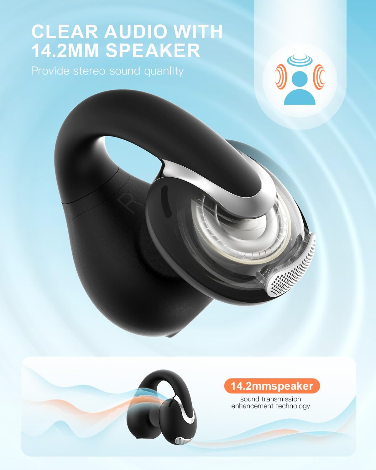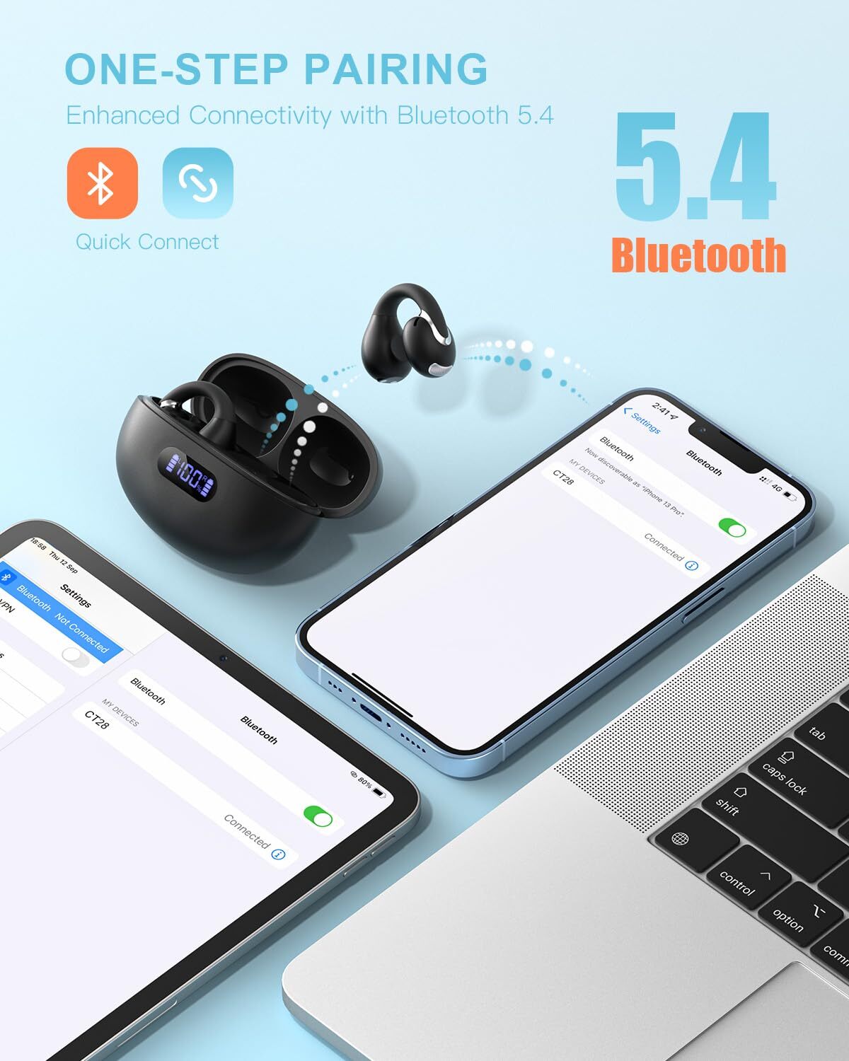 SUPREMEELY COMFORTABLE&ULTRA-LIGHT: Crafted from innovative, high-resilience materials and tailored with an ergonomic design for a perfect ear fit. This open ear headphone only weigh 0.2oz, can offer a barely-there sensation, allowing you to enjoy music with a lightweight and pressure-free experience CLEAR AUDIO&IMMERSIVE SOUND QUALITY: The bone conduction earbud feature a 14.2mm speaker, delivering rich stereo sound with deep bass and crisp treble. Utilizing bone conduction technology, allowing you to hear all of what’s around you while enjoying private sound. Maintain auditory awareness of your surroundings UPGRADE TO BLUETOOTH 5.4: Our open ear earbuds have advanced to the latest Bluetooth standard, offering a significantly faster and more accurate pairing process compared to the previous 5.3 version. Experience seamless connectivity and enjoy real-time audio synchronization for uninterrupted, pleasant listening enjoyment MUSIC MARATHON & DIGITAL DISPLAY: Each clip on earbud delivers up to 4.5 hours of immersive audio playback. The included compact charging case, which is fully charged in just 2 hours with the fast charging Type-C cable provided, extends your playtime by an additional 19.5 hours. Enjoy continuous musical enjoyment throughout the day without the inconvenience of frequent recharging TOUCH AND GO: The open ear headphones wireless bluetooth meets all your audio needs with a simple one-touch operation. Play/pause music, switch songs, volume +/-, activate Siri, and answer/hang up calls—all at your fingertips, immediately immersed in the music WATER RESISTANCE WITH IPX5: The CT28 ear clip earbud is equipped with a protective mesh that shields against moisture, boasting an IPX5 water resistance level, making them ideal for workouts and outdoor adventures. Please note that they are not suitable for swimming or full submersion in water