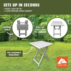 Aluminum Top Folding Table on your outdoor journeys for a convenient dining experience. Whether it's snacks or a full meal, this table is perfect for camping, tailgating, picnics, and more. With a compact and lightweight design, it's easy to carry anywhere and convenient to store in its half-folded size. Ideal for making memories during backyard campouts, riverside Saturdays with friends, or a solitary week in the wilderness. Great for camping, picnics, tailgating, backyard, and more Lightweight and rust-resistant The camping folding table is made of aluminum Folds in half size for easy storage Weight of table: 4.9 lbs Dimensions: 19.29" L x 18.7" W x 24.6" H Weight capacity: 110 lbs