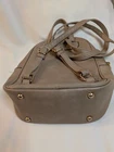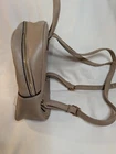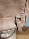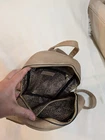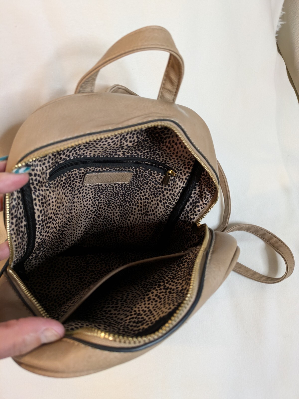 This is a small tan Light weight backpack purse designed for women. Gold Button Accents Front Pocker with bottom metal feet Backpack Backpack with zip-around closure Adjustable strap (1) Exterior slip pocket (1) Exterior zip pocket (1) Interior slip pocket (1) Interior zip pocket 4 metal feet for bottom protection Approximate Size: 11" x 11" x 4" There is a small spot near the shoulder strap on the back of backpack