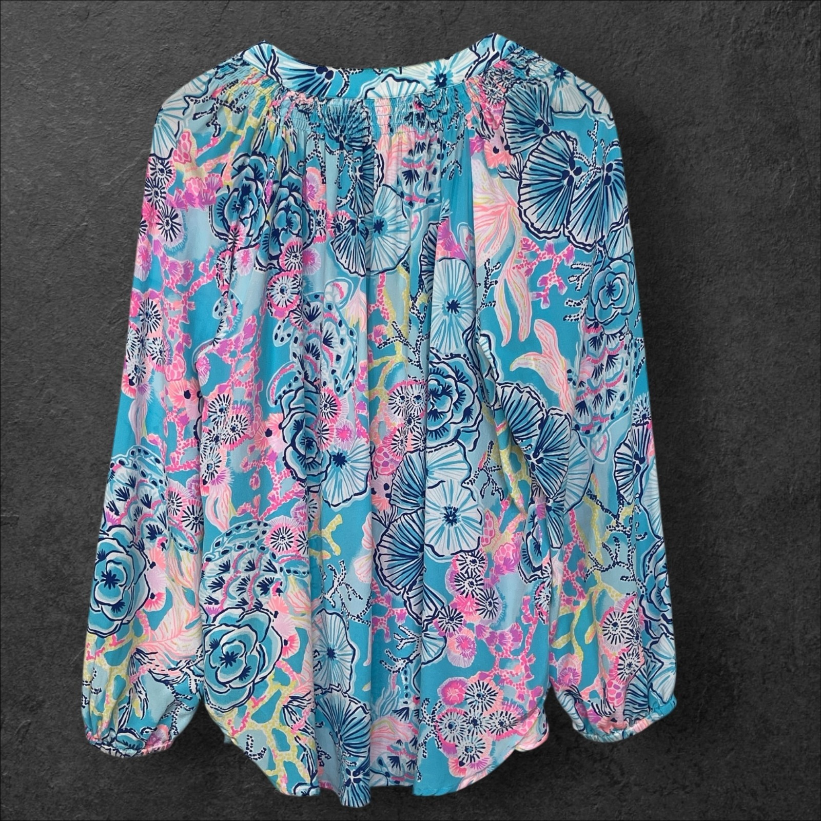 The Iconic Lilly Pulitzer "Elsa" Silk Top A true must-have for any Lilly lover, the Elsa Top is a timeless silhouette that effortlessly blends sophistication and relaxed, bohemian style. This gorgeous top is crafted from 100% luxurious, lightweight silk that drapes beautifully. This particular Elsa features a vibrant and cheerful coastal print with seashells, coral, and other sea life in signature bright shades of blue, pink, and yellow. The design is finished with a flattering V-neckline with gold-tone buttons, elegant smocking at the shoulders, and voluminous long peasant sleeves. Features: Brand: Lilly Pulitzer Style: Elsa Silk Top (Style# 003562) Size: XL (Extra Large) Color: Multicolor Coastal Print Details: Split V-neck with gold-tone button placket Smocked/shirred detail at neckline and shoulders Long balloon sleeves with elastic cuffs Material: 100% Silk Condition: Excellent pre-owned condition with no visible rips, stains, or flaws. Flat Lay Measurements (Approximate): Pit to Pit: 23" Length: 27" Care: Dry Clean Only. From a smoke-free home. Fast shipping! Keywords: Lilly Pulitzer, Lilly, Elsa Top, Blouse, Tunic, Size XL, X-Large, 100% Silk, Silk, Preppy, Resort Wear, Coastal, Beachy, Vacation, Cruise, Boho, Luxury, Peasant, Smocked, Long Sleeve, Coastal, Sea Life, Shell, Coral, Ocean, Tropical, RN 88189, SKU 14631