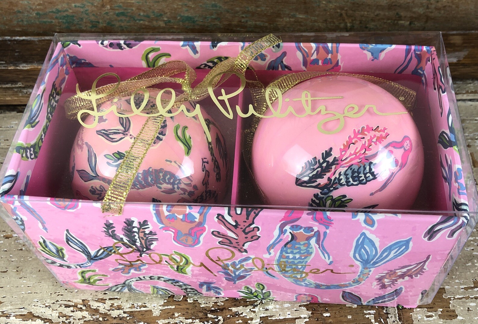 Lilly Pulitzer Christmas Ornament Set Mermaids Pink Balls Lot 2 New in open box.