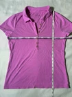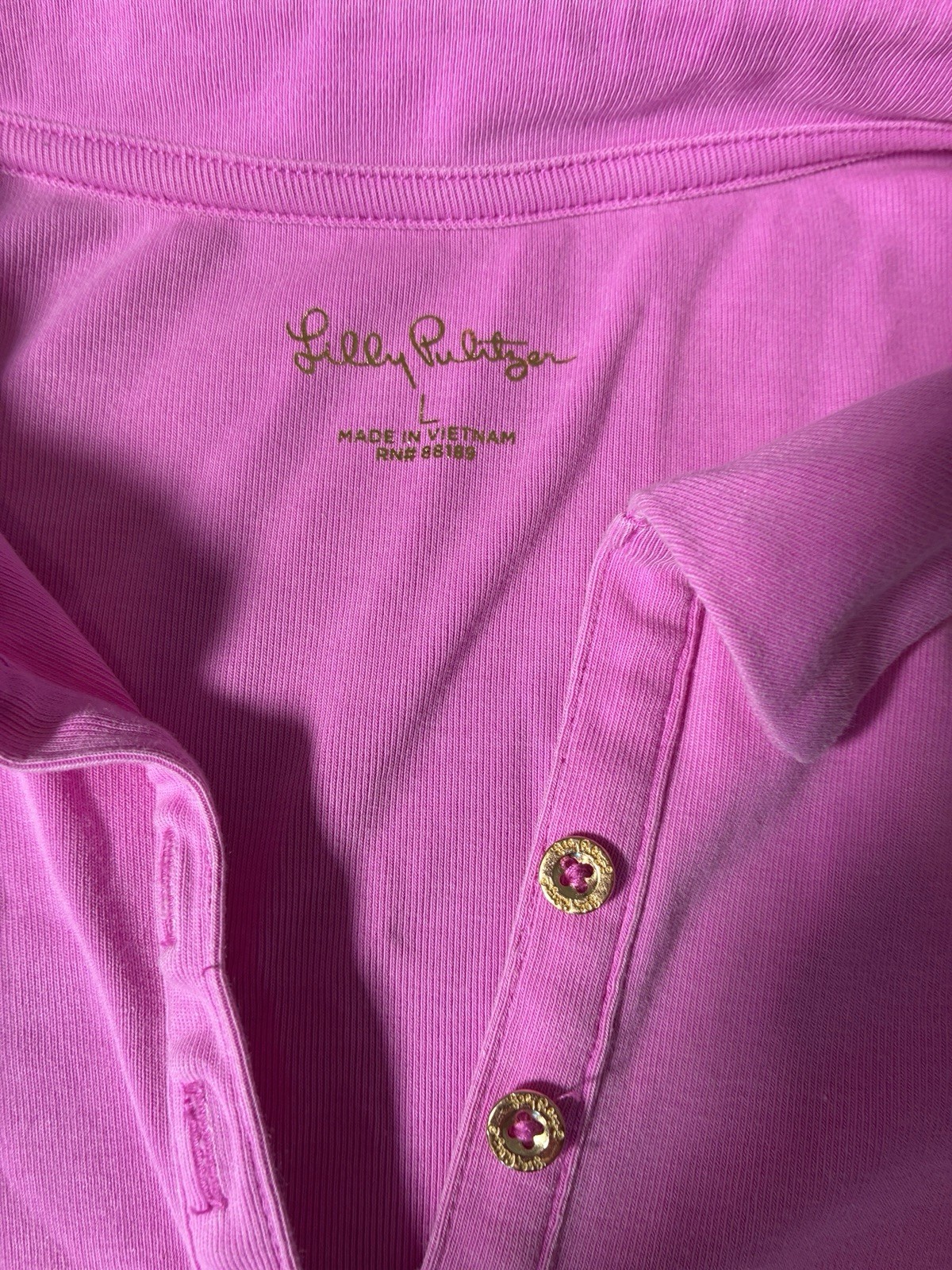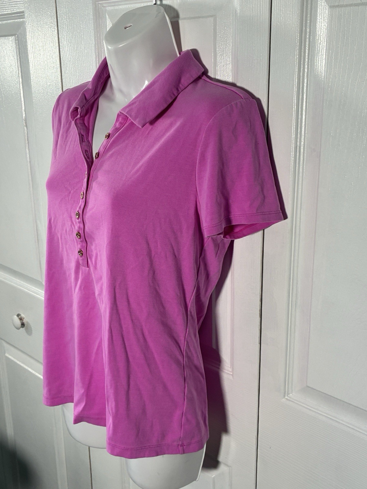 Lilly Pulitzer Womens Short Sleeve Reema Polo Shirt Aura Pink Cotton Size Large Measurements in photos A wardrobe staple, Reema is a fitted polo made from soft yet sophisticated Tropical Rib fabric. A collared neckline, button placket, and short sleeves complete the look. Fitted top with a collared neckline, logo button placket, and fitted short sleeves. 24 1/2" in length (based on a size small/4). Fits against body at chest, waist and hip with close-to-body line fit. Tropical Rib (55% Cotton, 38% Modal, 7% Spandex). Machine wash cold, separately, or dry clean.