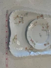 The beautiful floral pattern features thistles, making it a unique and elegant addition to any table setting. Made of high-quality porcelain, this vintage piece is perfect for serving desserts and cheeses. The set includes a dessert plate and a platter. This set of 2 pieces is perfect for hosting a small gathering and will impress your guests with its beauty and quality. Don't miss out on the chance to add this stunning Limoges France St. Lazare Haviland Floral Thistle Serving Platter/Dessert Plate to your collection! From a smoke free home.