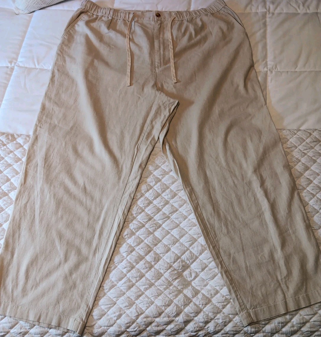 Nice pre-owned linen blend (55% linen, 45% cotton) pants in an oatmeal color. The size is 2XL with a 30-inch inseam. The waist is elastic with a drawstring. The fit is relaxed. Please message me for additional photos, measurements, or information.