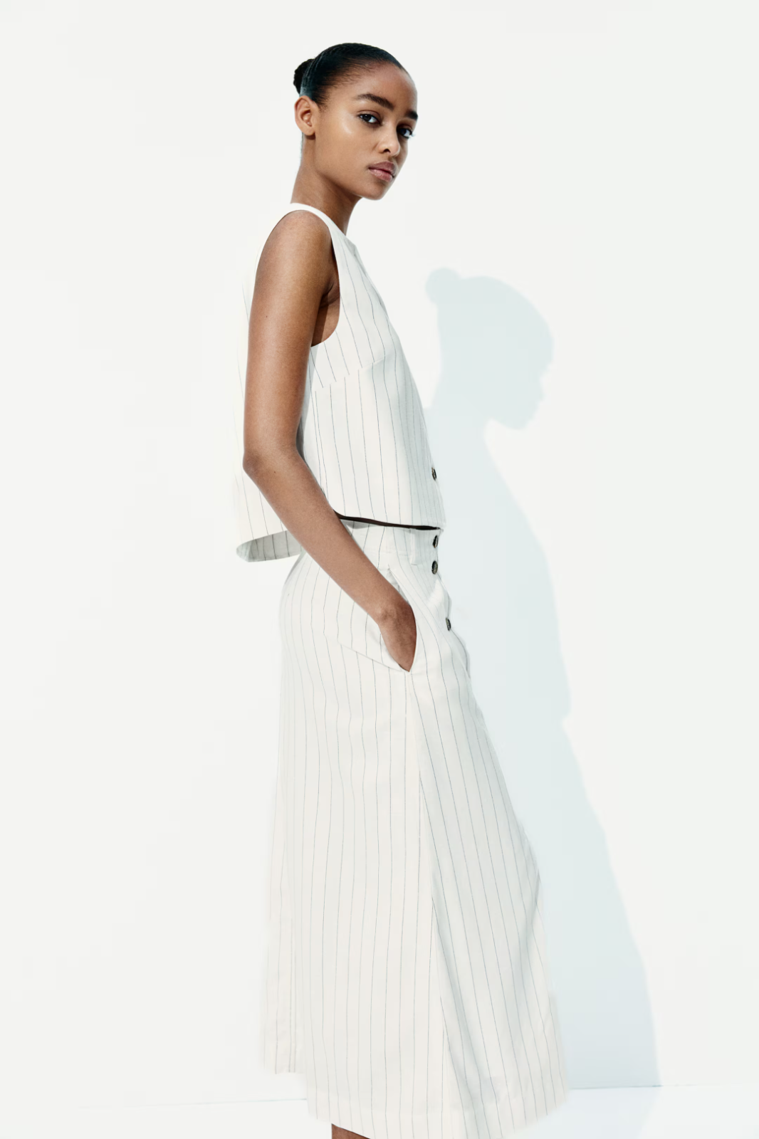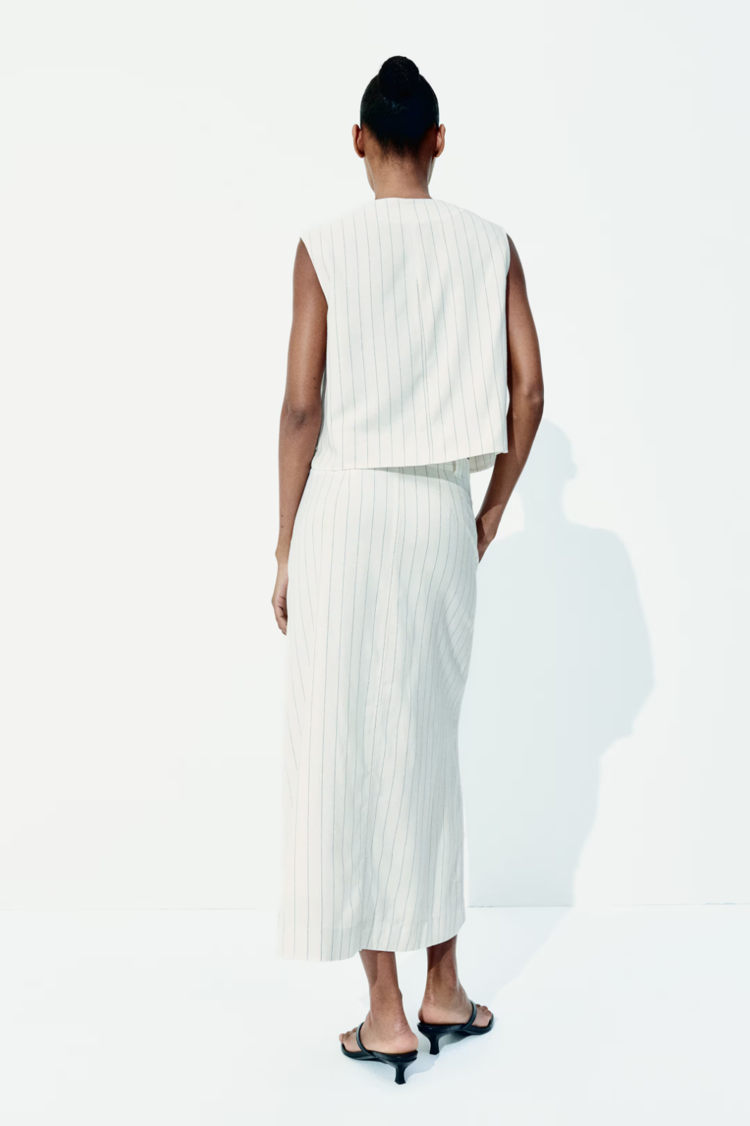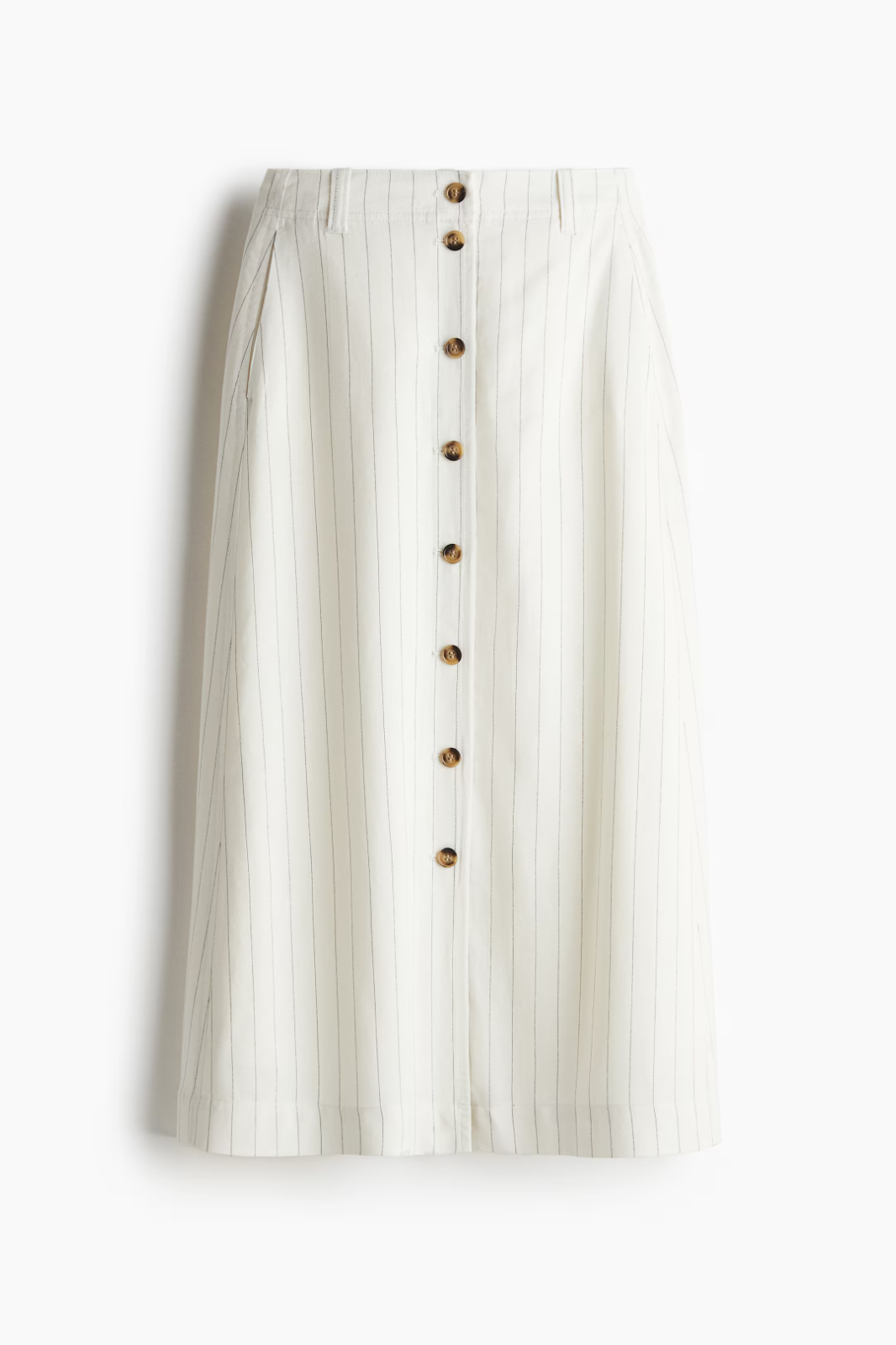 Description & fit Calf-length, A-line skirt in an airy, woven viscose and linen blend. High waist, buttons at front, and discreet side pockets. Forward-facing side seams. Lining in cotton voile. Art. No.: 1273534001 Size: Waist: Circumference: 30 in (Size 8) Back: Length: 33 in (Size 8) Length: Midi Waist Rise: High waist Fit: Regular fit Description: Cream/black, Pinstriped Imported: Yes Materials Composition Shell:Rayon 85%, Linen 15% Lining:Cotton 100% Additional material information The total weight of this product contains at least: · 64% Livaeco™ Viscose We exclude the weight of minor components such as, but not exclusively: threads, buttons, zippers, embellishments and prints. The total weight of the product is calculated by adding the weight of all layers and main components together. Based on that, we calculate how much of that weight is made out by each material. For sets and multipacks, all pieces are counted together as one product in calculations. Material: Linen Materials in this product explained Cotton Cotton is a soft and versatile natural fiber harvested from the cotton plant. Linen Linen is a natural bast fiber derived from flax plants. Livaeco™ Viscose Livaeco™ viscose is a branded viscose fiber, made from wood pulp. Rayon Viscose is a regenerated cellulose fiber commonly made from wood, but the raw material could also consist of other cellulosic materials. Care guide Bring your clean, previously loved clothing or textiles to one of our stores — they can be from any brand. Read about how you can make your clothes last longer Care instructions Only non-chlorine bleach when needed Medium iron Machine wash cold Line dry Can be dry cleaned US 6 8 10 EUR 38 40 42 Waist inch 27½-29 29-30¾ 30¾-32½ Waist cm 70-74 74-78 78-82.5 Low hip inch 37-38¼ 38¼-39½ 39½-40¾ Low hip cm 94-97.5 97.5-100.5 100.5-103.5