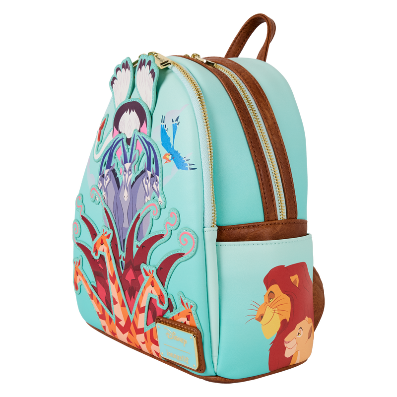 Much like the soon-to-be king of the savanna, this collection totally rules! Step into the spotlight with a mini backpack inspired by a sing-along moment from Disney’s The Lion King . You can even set the scene in motion with moveable ostrich wings to add dramatic effect! With its bold colors and nostalgic design, this accessory will be the main event for any outfit. Features: Faux leather (polyurethane) Adjustable shoulder straps Front zipper pocket Side drop pockets Shiny gold hardware Applique, debossed, textured, and printed details Coordinating inside lining Dimensions: 9”W x 10.5”H x 4.5”D 22.9 cm W x 26.7 cm H x 11.4 cm D