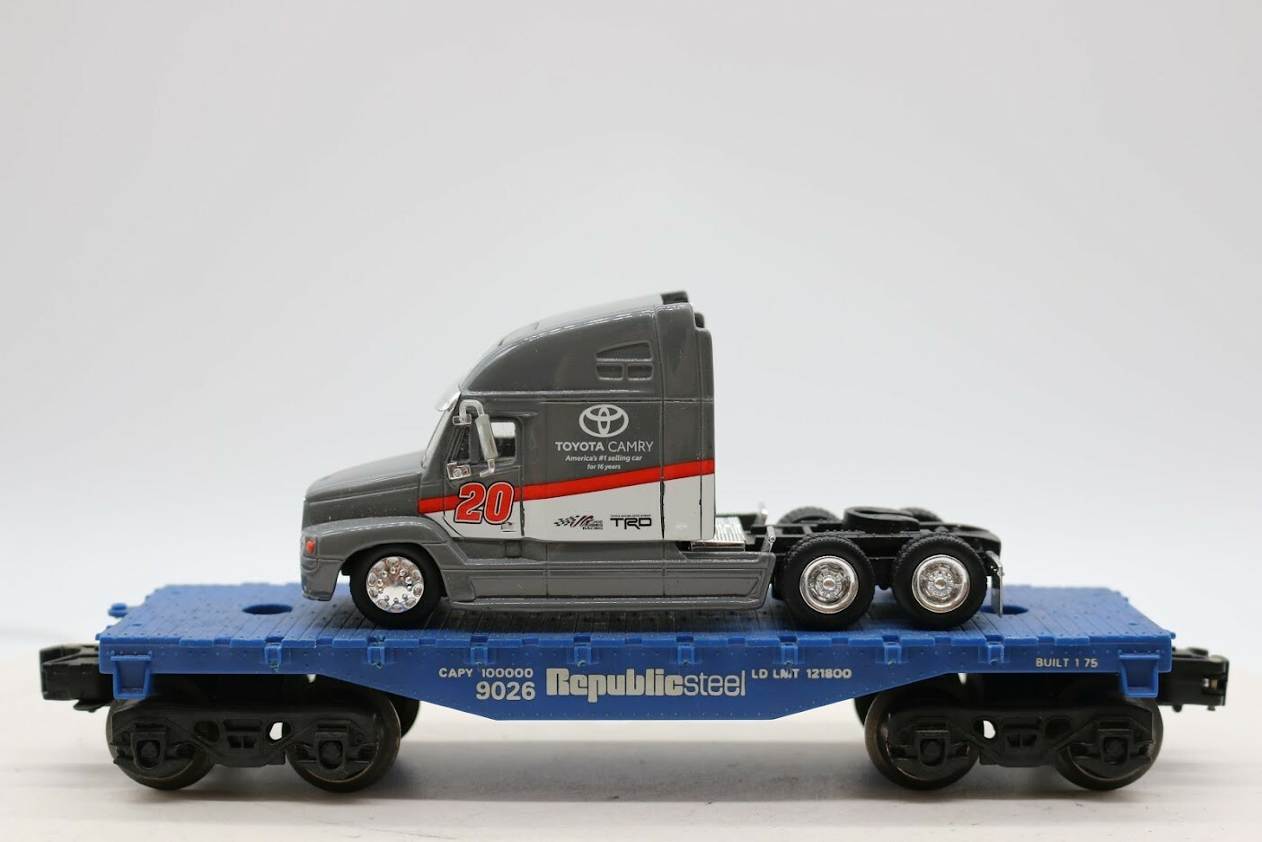 Lionel MPC Republic Steel Flatcar w/Toyota Racing Camry #20 Semi-Truck Excellent Comes as is, Ships USPS Ready To Roll!! THE SHIPPING COST YOU SEE LISTED IS FOR SERVICE TO ALL ZIP CODES IN THE CONTINENTAL U.S.A. ALASKA AND HAWAII WILL BE MORE! IT IS WHAT YOU WILL PAY FOR SHIPMENT. IT INCLUDES HANDLING AND PACKING MATERIALS. WE SHIP, DEPENDING ON SIZE AND WEIGHT, ...OUR CHOICE. WE WILL ONLY SHIP TO CONFIRMED ADDRESSES! COMBINED SHIPPING WHEN POSSIBLE! IT IS POSSIBLE YOU WILL RECEIVE MORE THAN ONE BOX ON MULTIPLE AUCTIONS DUE TO SIZE RESTRICTIONS AND GUIDELINES SET BY SHIPPING COMPANIES. NO LOCAL PICK-UP.....ALL ITEMS ARE SHIPPED. INTERNATIONAL BUYERS MUST USE PAYPAL! E-MAIL INQUIRIES SENT ON THE WEEKEND WILL BE ANSWERED THE FOLLOWING BUSINESS DAY. ----- ONCE AN ITEM IS PAID FOR IT WILL SHIP OUT--WE CANNOT 'HOLD' ITEMS AFTER THEY ARE PAID FOR, PLEASE DON'T ASK. ABOUT PAYMENT While we do Prefer Prompt Payment via Paypal...... We do COMBINE shipping for auction items won within 12 hours if possible and box sizes permit! Items must be listed on the same invoice to combine shipping. We usually ship daily, Monday thru Friday! All items are shipped and well packed. NO LOCAL PICK-UP. This item qualifies for our NO-RISK guarantee, see return details! ABOUT FEEDBACK We reserve the right to CANCEL bids from bidders with zero feedback or bidders with excessive negative feedback! If you have ZERO feedback, you must e-mail us first BEFORE you bid! Our goal is for a Positive experience with Positive, 5 Star feedback for us both! We will return all positive feedback received. If you have a problem with an item, E-MAIL US FIRST before leaving feedback. Every effort is made to describe our items to the best of our ability! If we make a mistake, please give us the chance to make it right for you! 100% satisfaction is our goal! It is not our intention to deceive anyone, so please work with us! Thanks for your bid and Good Luck! ABOUT OUR INVENTORY Most items up for auction here were previously owned! Some of them may be mint and some are hardly used. In any case, there are NO warranties provided by us, either express or implied, on any item purchased! If grading is given on an item it refers only to the cosmetic appearance of the item and not to its operation. Our Guarantee is only on the description of the item, however, if we state in the listing that the item is sold as-is, then NO description guarantee is in effect and that sale would be final! We do not test post-war horns, toy train couplers, or interior lights on passenger cars and cabooses or stated/ mentioned. INTERNATIONAL SHIPPING INTERNATIONAL BUYERS: The shipping cost you see in the listing is for the Continental U.S. only! The full value of the item purchased will be declared on customs forms! No exceptions! There may be other fees required in your country to receive this item! Delays due to customs or customs fees are not our fault or responsibility!! You are responsible for payment of those amounts whatever they are. We now use only E-bay's Global shipping program for overseas shipping! Be patient with shipping because it may take some time. Before declaring a package is lost, you agree to allow 30 days from the shipment date for it to arrive. We accept only PAYPAL for international purchases and shipments!