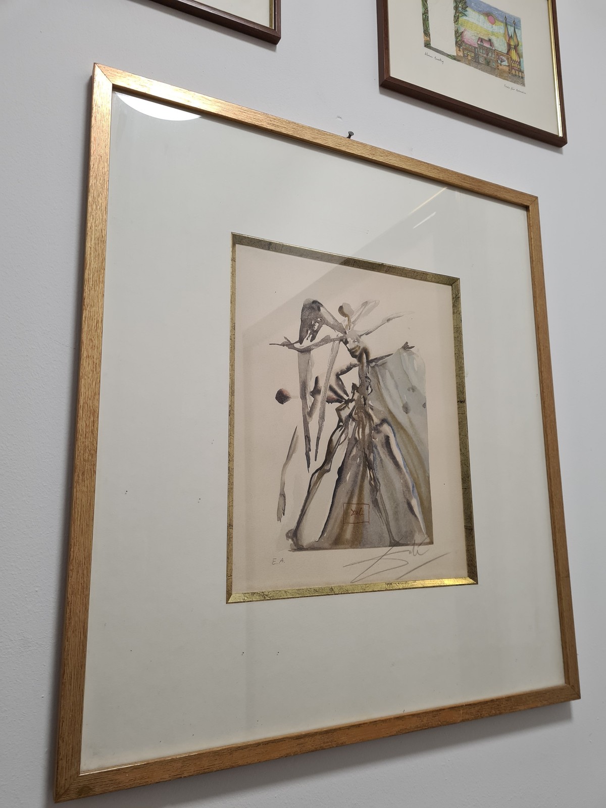 Herzlich willkommen, angeboten wird eine signierte Lithographie von Salvador Dalí mit Zertifikat . Artikelnummer: LU75A/0102 Maße: Höhe: 60 cm Breite: 52 cm Produktdetails: Künstler: Salvador Dalí Technik: Lithographie Serie: Illustrationen zur "Divina Commedia" Besonderheiten: Handsigniert und mit Zertifikat aus dem Jahr 1974 Rahmung: Hochwertiger Holzrahmen mit Goldakzenten Zustand: Guter Zustand, gebraucht, mit minimalen Gebrauchsspuren. Die Bilder sind Teil der Zustandsbeschreibung. Versand: Wir versenden per GLS, UPS und DHL versichert weltweit.