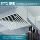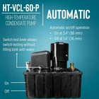 Little Giant HT-VCL-60-P 1/3 HP, 208-230-Volt, 62-Ft. Shut-off, High Temperature Plenum Condensate Pump with 14-Ft. Lead Wires, Black, 553160102 Brand Little Giant Color Black Material Nylon, Polypropylene (PP) Style 1/3 hp, 208-230V Product Dimensions 12"L x 6"W x 11.7"H Power Source Corded Electric Item Weight 12.5 Pounds Maximum Flow Rate 9.58 Gallons Per Minute Maximum Lifting Height 62 Feet Voltage 230 Volts See more About this item HIGH TEMPERATURE CONDENSATE REMOVAL PUMP: designed for plenum applications with the capability to handle the most difficult commercial applications; maximum temperature 212 °F (100° C) AUTOMATIC OPERATION: built in float switch; uniquely constructed with an external test lever to ensure pump is functioning without the requirement of filling the tank SAFETY SWITCH WIRING INCLUDED: can be connected to shut down the appliance or set-up to activate an audible alarm (alarm not included) 14' LEAD WIRES INCLUDED: must be hard-wired (plug not included); electrical experience is required SPECIFICATIONS: 208-230-volts, 1.8 Amps, 300 Watts, 575 GPH at 5' lift, 62' shut-off, maximum 26.9 PSI, top and bottom inlets, CSA listed in US and Canada; UL2043 standard compliant; 1 gallon tank