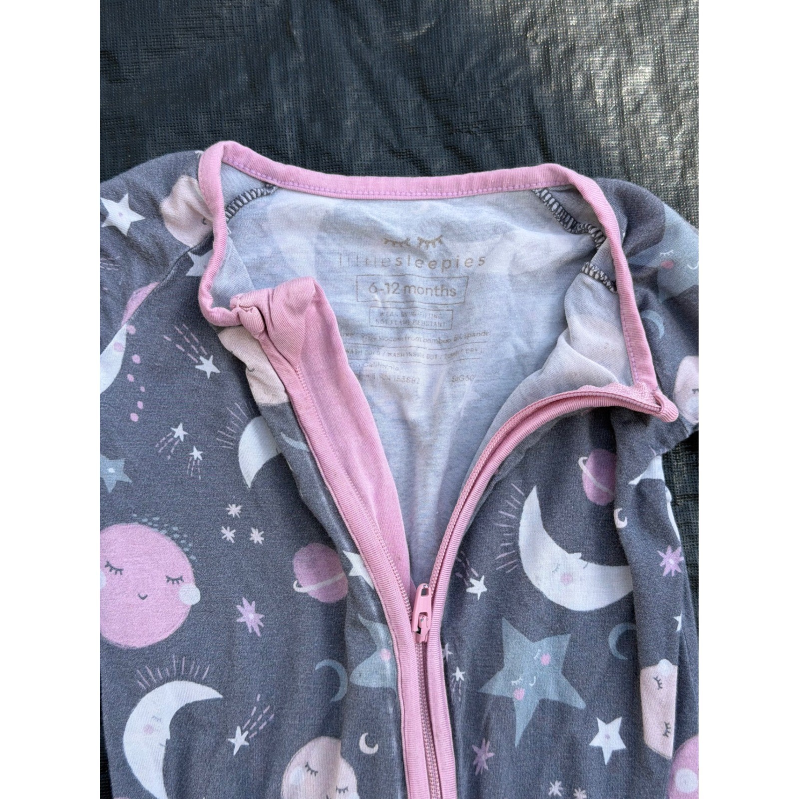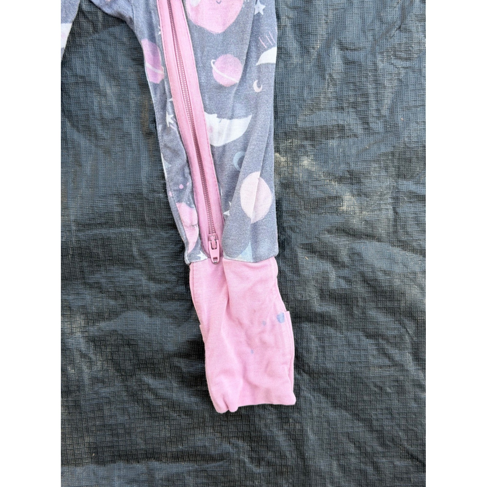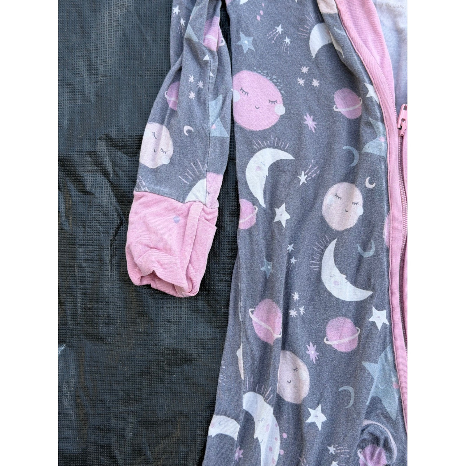 Soft bamboo viscose Zippy from Little Sleepies features a celestial print with moons, stars, and planets in shades of gray and pink. Designed for comfort and longevity, this one-piece includes a double zipper for easy diaper changes and fold-over cuffs on both hands and feet to convert from a footless romper to a footie. The stretchy fabric ensures a snug yet flexible fit for growing babies. Please reference all photos for condition/flaws.