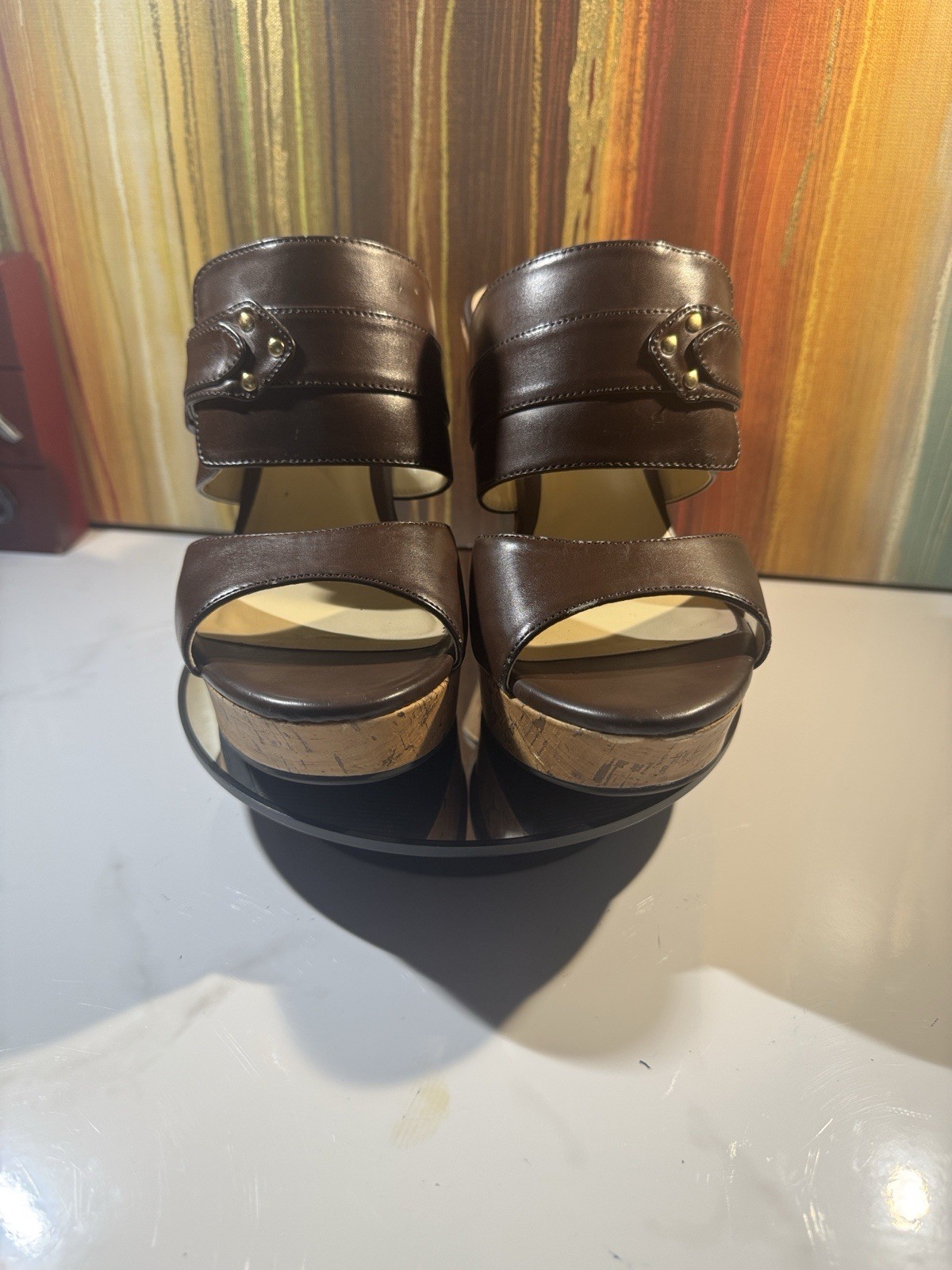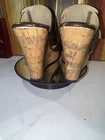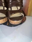 Chic Liz Claiborne Women’s Brown Faux Leather Slip-On Platform Cork Wedge Sandals Size 7.5M. These classic Liz Claiborne wedge heel sandals will complement any outfit. There are slight scuffs on the back of the heels and on the left of the front shoe but overall these are in excellent condition. See all pictures. DETAILS Brand: Liz Claiborne Slip-on Two upper straps Faux buckle elastic gore Open toe Cork wedge heel Size: 7.5M Heel height - 4.5 inches Platform - 1 inch