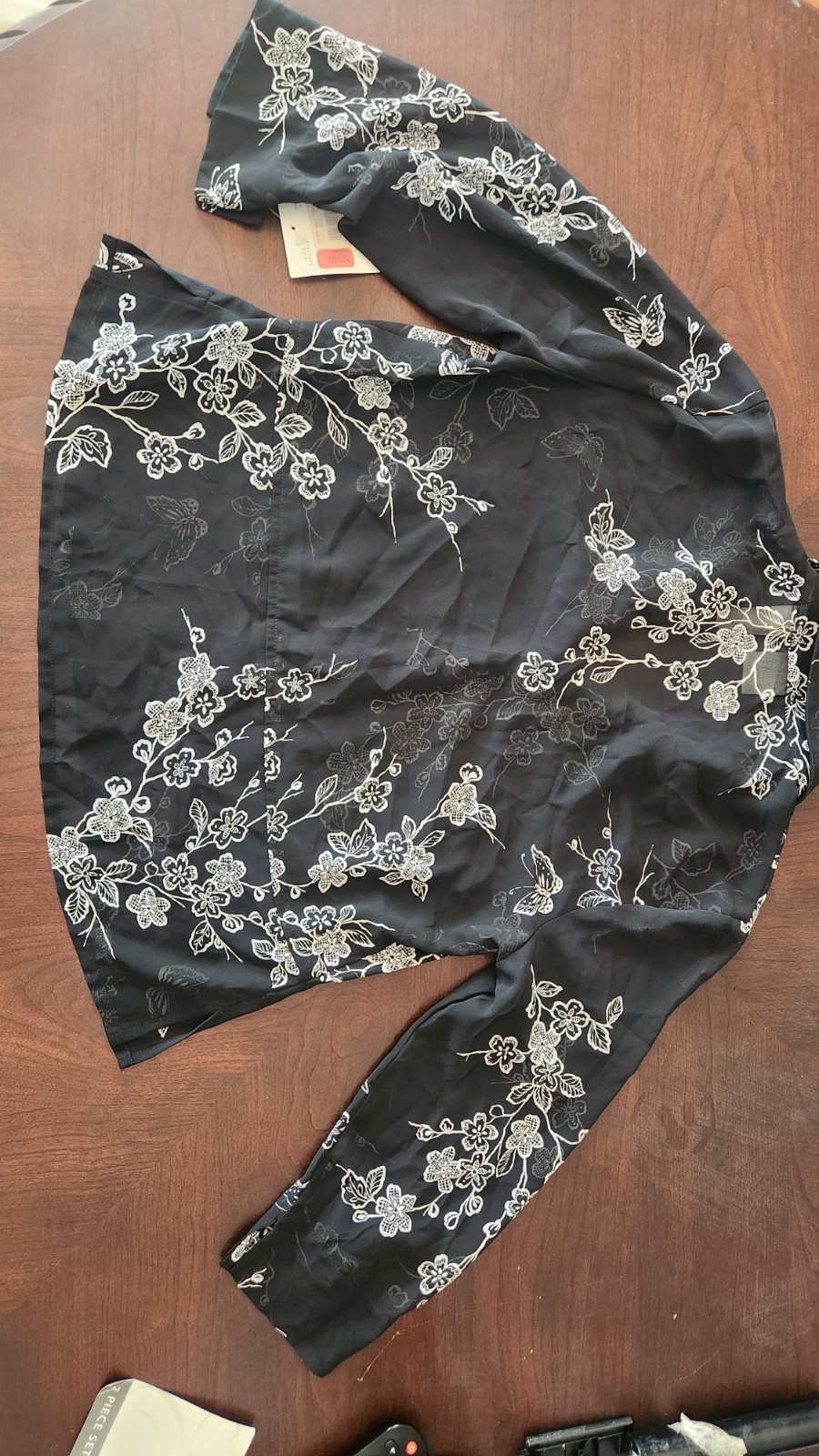 The EMMA JAMES by Liz Claiborne Black Floral Sheer Chiffon Button Blouse in size 8P is a stylish and versatile top suitable for various occasions such as parties, formal events, and business meetings. Made of polyester chiffon, this blouse features a collared neckline, 3/4 sleeves, and a button closure for a classic look. The sheer fabric adds a touch of elegance, while the black floral pattern adds a feminine and trendy touch. This blouse is machine washable for easy care and is designed for a regular fit, making it a practical and fashionable choice for any woman's wardrobe.