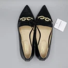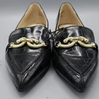 These loafers scream "I'm in charge" while quietly mumbling, "but I also have a softer side." Perfect for strutting into any office or coffee shop. The gold snake hardware says, "Don't mess with me," while the croc texture whispers, "but I'm still chic." • Pointed-toe design for a sleek look • Gold snake hardware adds striking detail • Black croc texture for an elegant finish • Slight heel for added comfort Features: career, business, ballet flat, elevated basic, croc, gold hardware, twee, NWT, office, corporate, polished, classic, timeless, sophisticated, edgy Size: Womens 6M Condition: New With Tags New with tags, see photos for details.