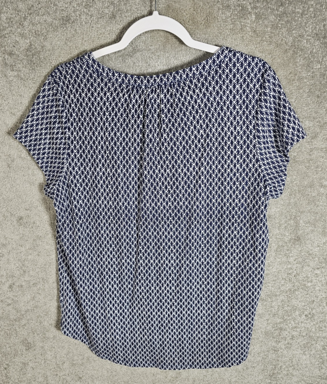 Liz Claiborne Popover Top Womens Large Blue White Geometric Short Sleeve Vneck Please note, item measurements are approximate and provided in the photos. Previous washings may change the sizing. Please compare our measurement photos to your favorite garments to ensure fit, especially for vintage clothing No flaws are seen. Thank you for supporting our small family owned business! U00333