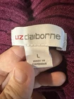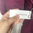 The Liz Claiborne women's sweater in size Large is a stylish and versatile piece perfect for various occasions from casual to business. Made from a blend of polyester, nylon, and rayon, this tight-knit sweater features a solid magenta color with a v-neckline and 3/4 bell sleeves accented with glitter details. The lightweight and stretchy fabric make it comfortable to wear in all seasons of winter, fall, and spring. Easy to care for with machine washable instructions, this pullover sweater is a classic and colorful addition to any woman's wardrobe. The pit to pit is 19 inches and the shoulder length down is 26 inches