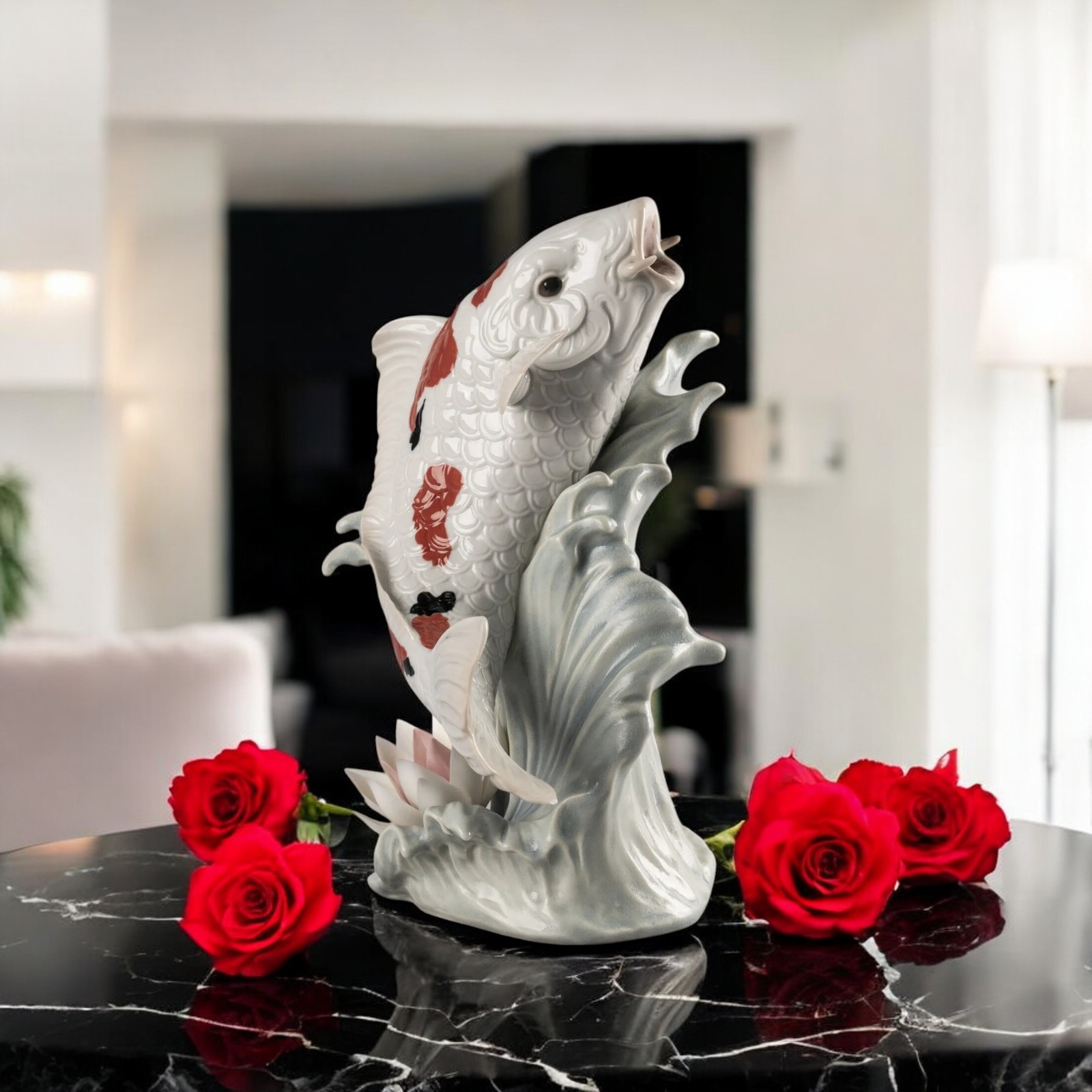 Lladro 01009431 Koi Figurine #9431 Lladro 01009431 Koi Figurine #9431 Lladro Koi Figurine – A Symbol of Love and Friendship SKU : 01009431 Celebrate the elegance and symbolism of the koi fish with this stunning Lladro porcelain figurine. Combining artistic stylization with lifelike realism, this handcrafted masterpiece captures the essence of one of the most cherished symbols in oriental culture. Product Description This exquisite figurine portrays a koi fish of the renowned sanke variety, distinguished by its vibrant red and black markings with subtle grey accents on the fins. Crafted in a blend of glossy and matte finishes, the design is further enriched with a delicate waterlily, meticulously handmade petal by petal, evoking the serene beauty of a koi pond. Key Features Material : Premium porcelain with a combination of gloss and matte finishes. Signature Design : Vibrant red and black patterns with fine grey details, true to the iconic sanke koi. Dimensions : Height : 31 cm (12.205 in) Width : 21 cm (8.268 in) Length : 24 cm (9.449 in) Weight : 1.75 kg (3.86 lbs) Sculptor : Designed by the accomplished artist Virginia González . Special Touch : Includes insurance for secure shipping and peace of mind. Why Choose This Figurine? The Lladro Koi Figurine is more than just a decorative item; it is a celebration of artistry, love, and friendship. Perfect for collectors, animal lovers, or those who appreciate oriental culture, this piece embodies serenity and timeless elegance. Perfect for Home or Gifting Enhance your home or office with the tranquil beauty of this koi fish sculpture. An exceptional gift for art enthusiasts, nature lovers, or anyone marking a special occasion. Care Instructions To keep its beauty intact, clean gently with a soft, dry cloth. Add the Lladro Koi Figurine to your collection or gift it to someone special. This handcrafted work of art is a tribute to love, harmony, and the enduring appeal of the koi fish. Returns Policy We offer a 14-day return policy for your peace of mind. If you’re not satisfied with your purchase, you may return the item at your own cost, provided it’s in its original condition with all packaging intact. Please ensure the return shipment is fully insured to cover any potential damage during transit. Damaged Items In the rare event of damage upon delivery, please: Retain all packaging and boxes. Provide photos of the damaged item and packaging to help us process insurance and shipping claims. Contact us within 24 hours of receipt to arrange for a refund or replacement, subject to availability. Import Duties Import duties or taxes, if applicable, are the buyer’s responsibility. These fees are determined by your local customs office, and we recommend consulting them for specific charges. TRE SKOR does not collect or control these fees. Non-Claimed Products If a shipment is unclaimed due to refusal to pay customs duties or delays in providing required documents, resulting in its return, TRE SKOR reserves the right to charge the customer for both the initial shipping and any return fees incurred. This applies to orders shipped with FREE SHIPPING . Notification Process We will make reasonable attempts to notify you via the email associated with your eBay account before applying any charges. Acknowledgment By purchasing from TRE SKOR, you agree to abide by our Shipping, Returns, and Non-Claim Policy . For any questions or assistance, please don’t hesitate to contact our customer service team. Explore more treasures in our store here: Visit TRE SKOR on eBay Thank you for choosing TRE SKOR—we look forward to serving you!